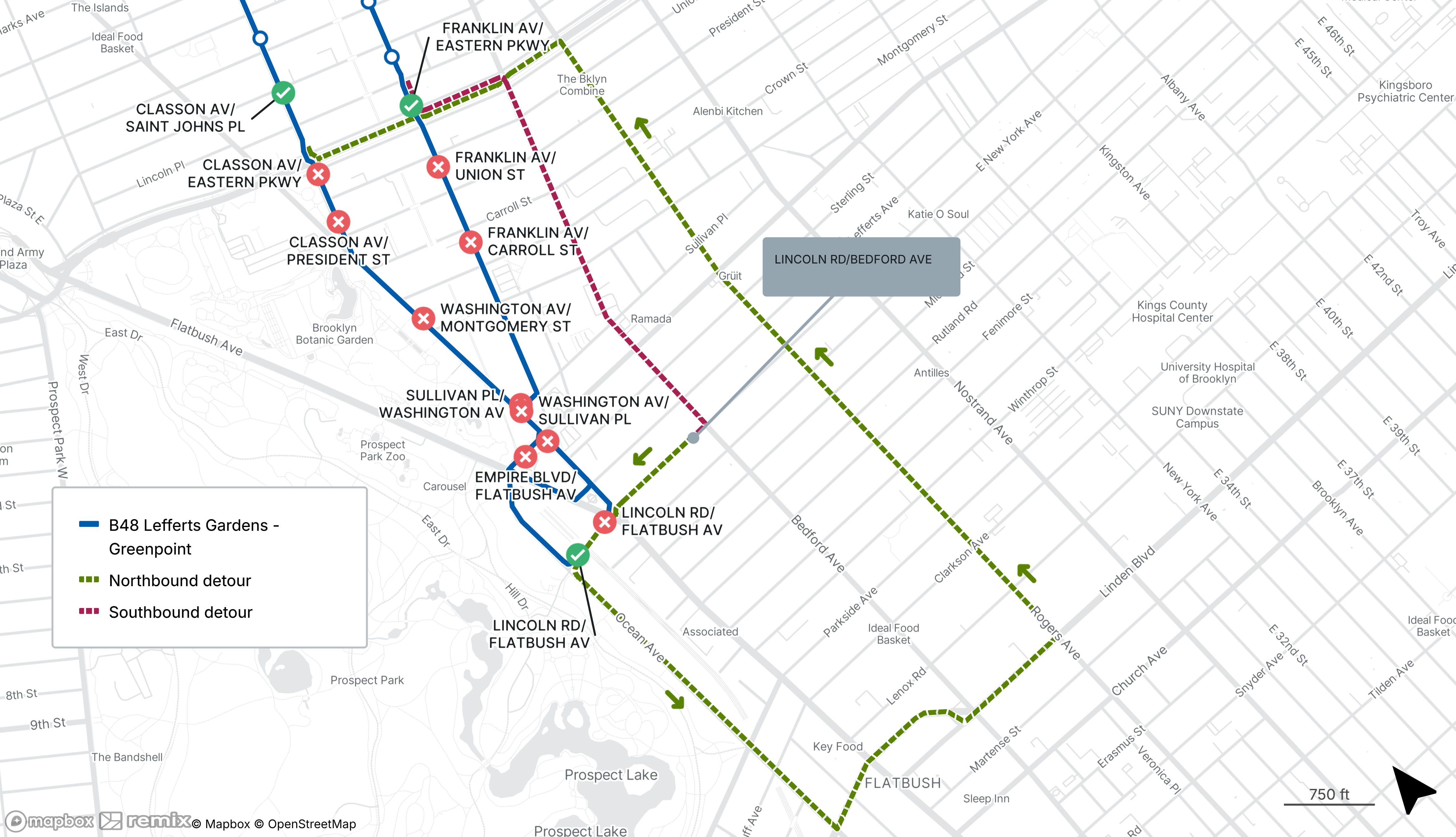 B48 buses are detoured in both directions between Lincoln Rd at Bedford Ave and Classon Ave at Eastern Parkway