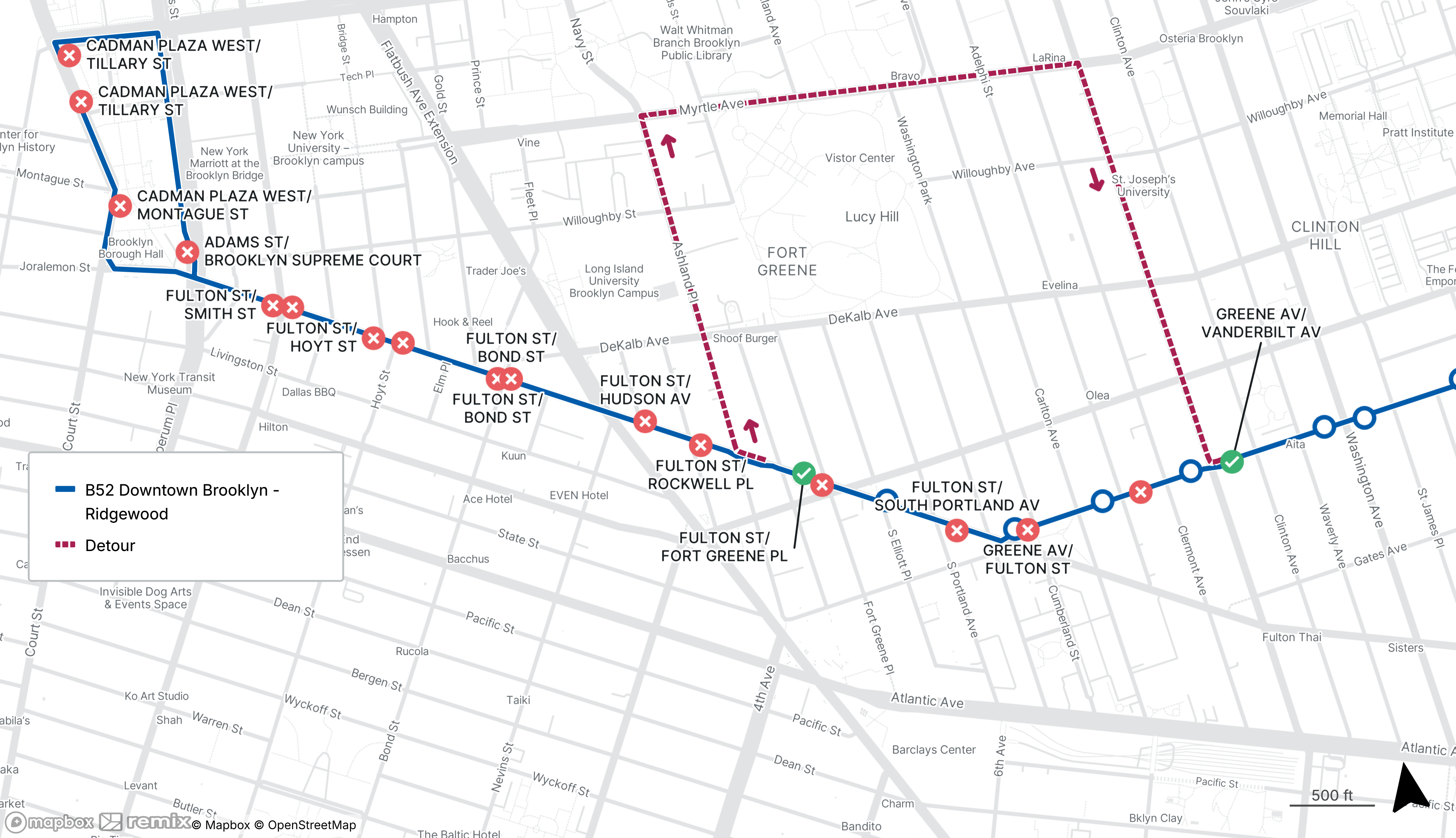 B52 buses will be detoured between Downton Brooklyn and Clinton Hill