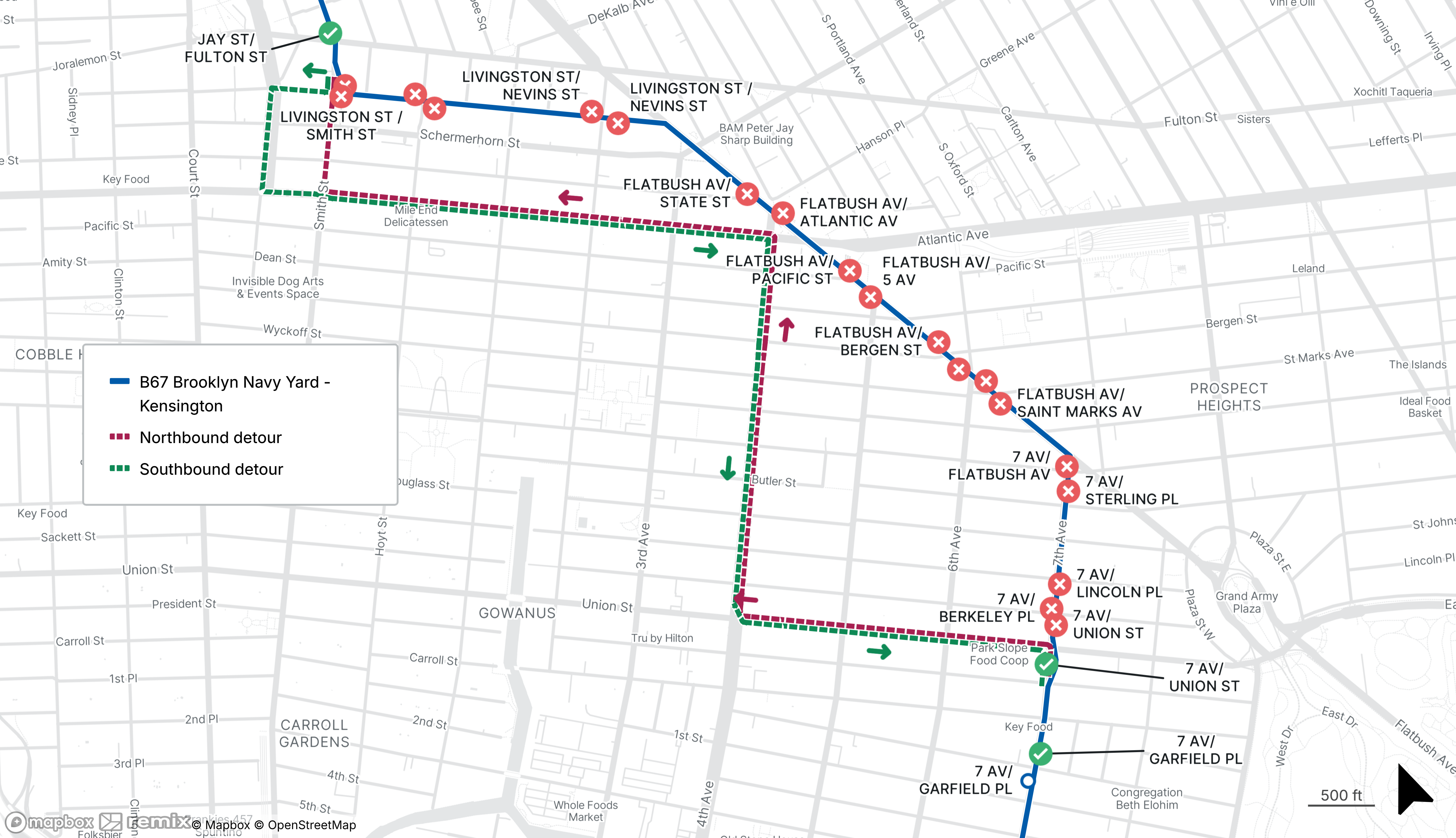 B67 buses will be detoured between 7th Ave at Prospect Ave and Smith St at Livingston St