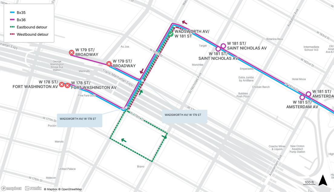 Bx35 and Bx36 eastbound stop on W 178th St at For Washington Ave and westbound on W 179th St at Broadway will be closed