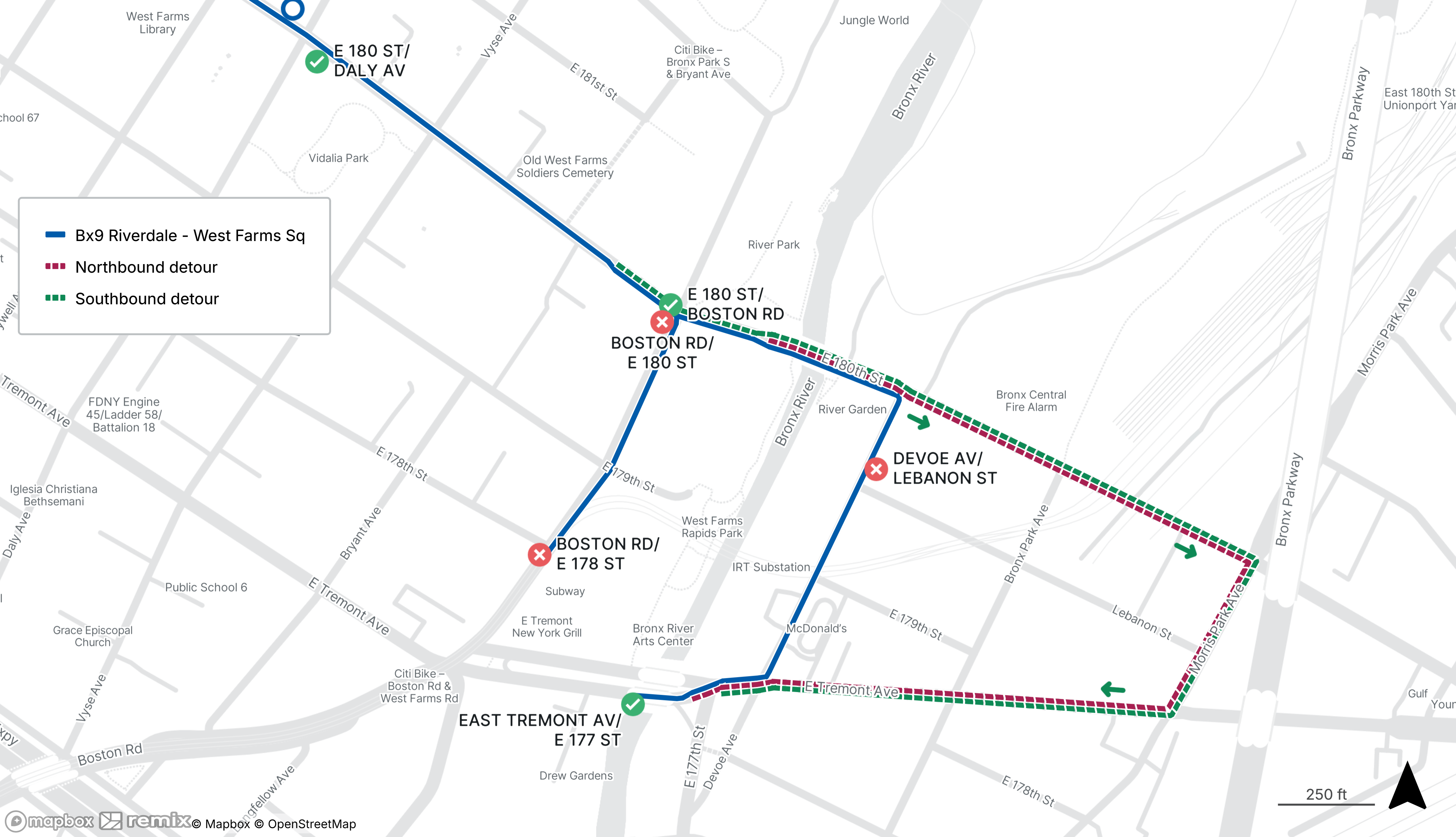 Bx9 buses will be detoured between East Tremont Ave at Morris Park Ave and E 180th St at Boston Rd