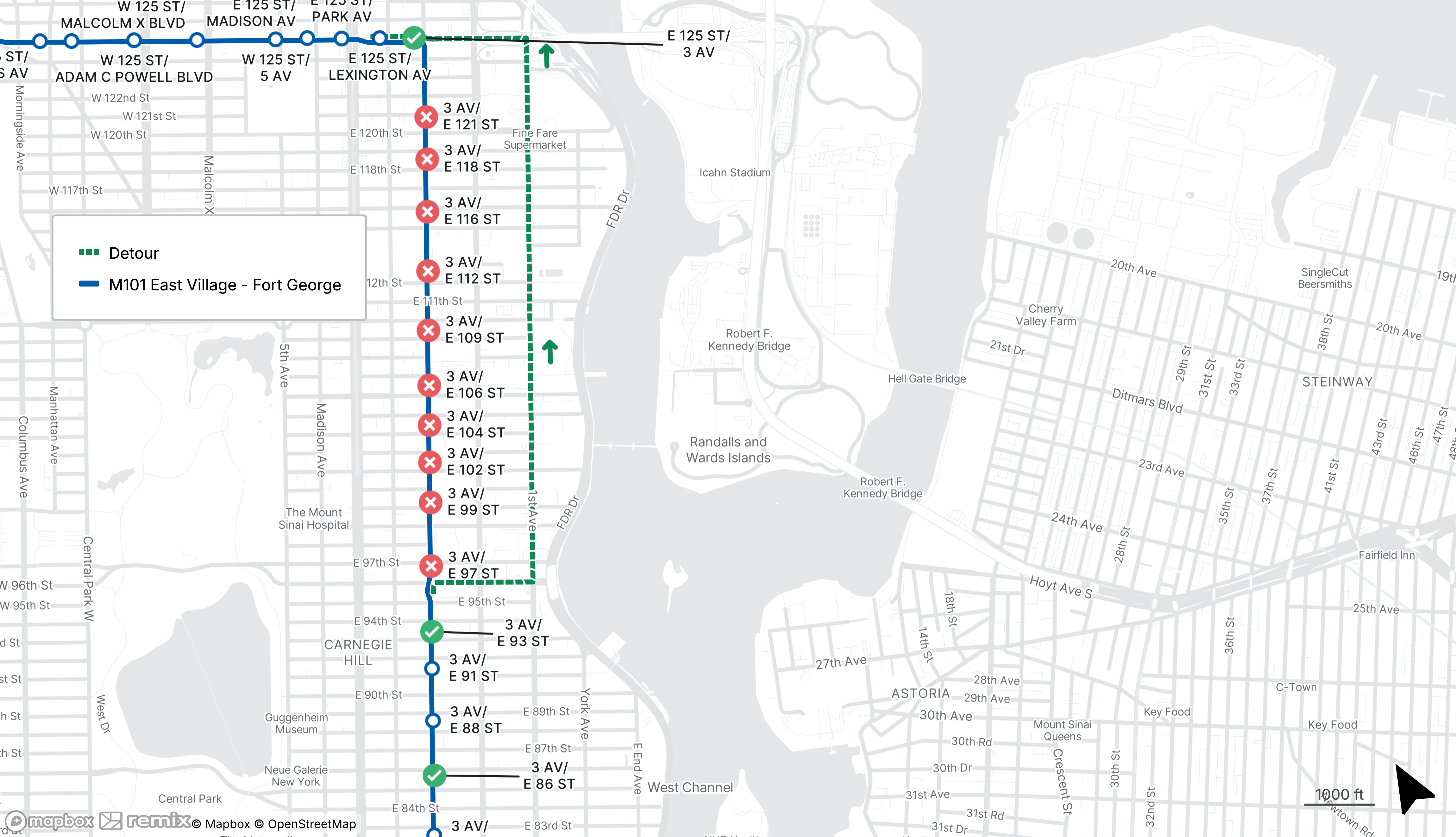 Northbound M101 stops on 3rd Ave from E 97th St to E 121st St will be closed