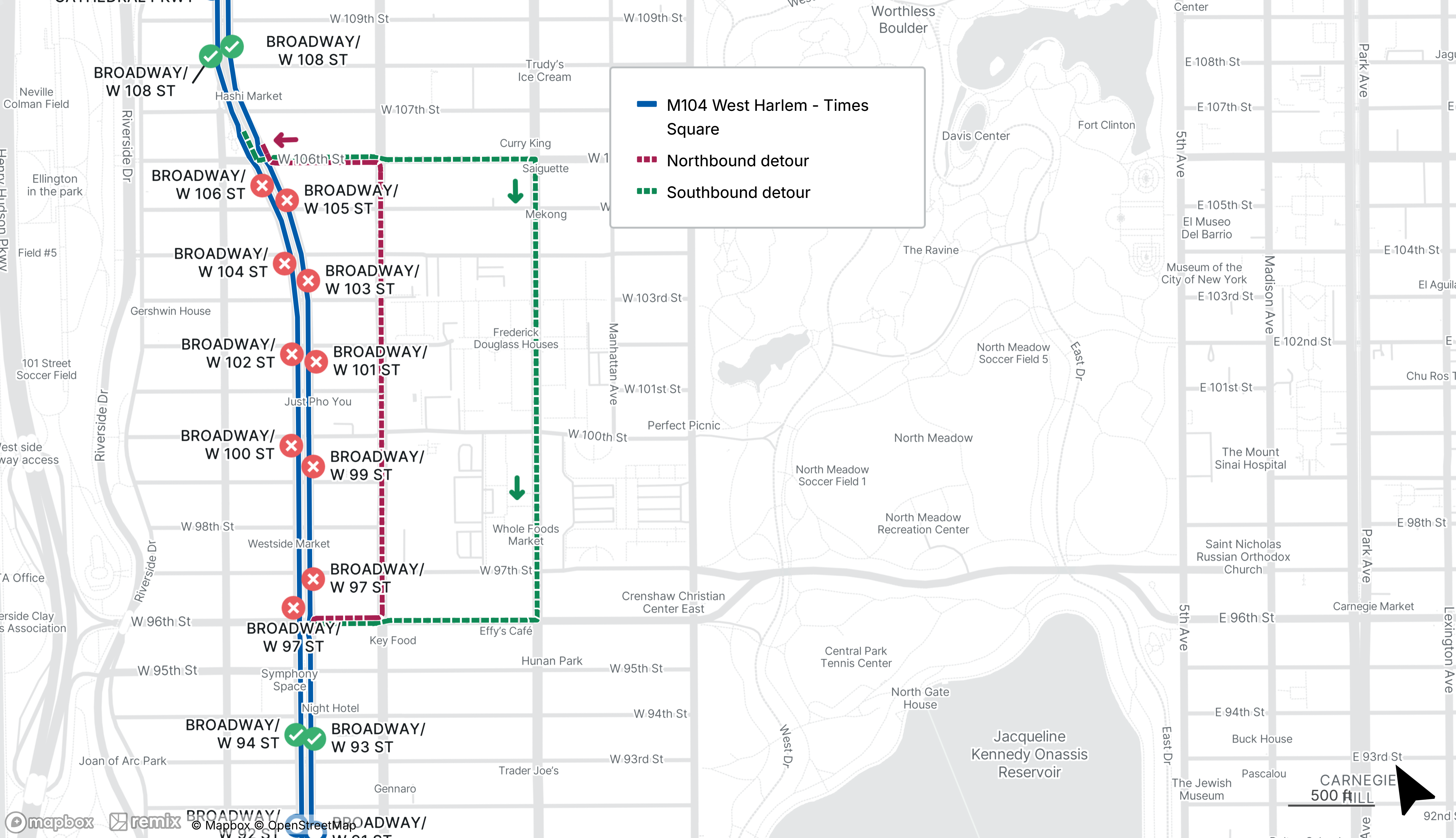 Starts Sun Apr 5 Until Sun Apr 5For northbound service, use the stops on Broadway at W 93rd St or W 108th St.