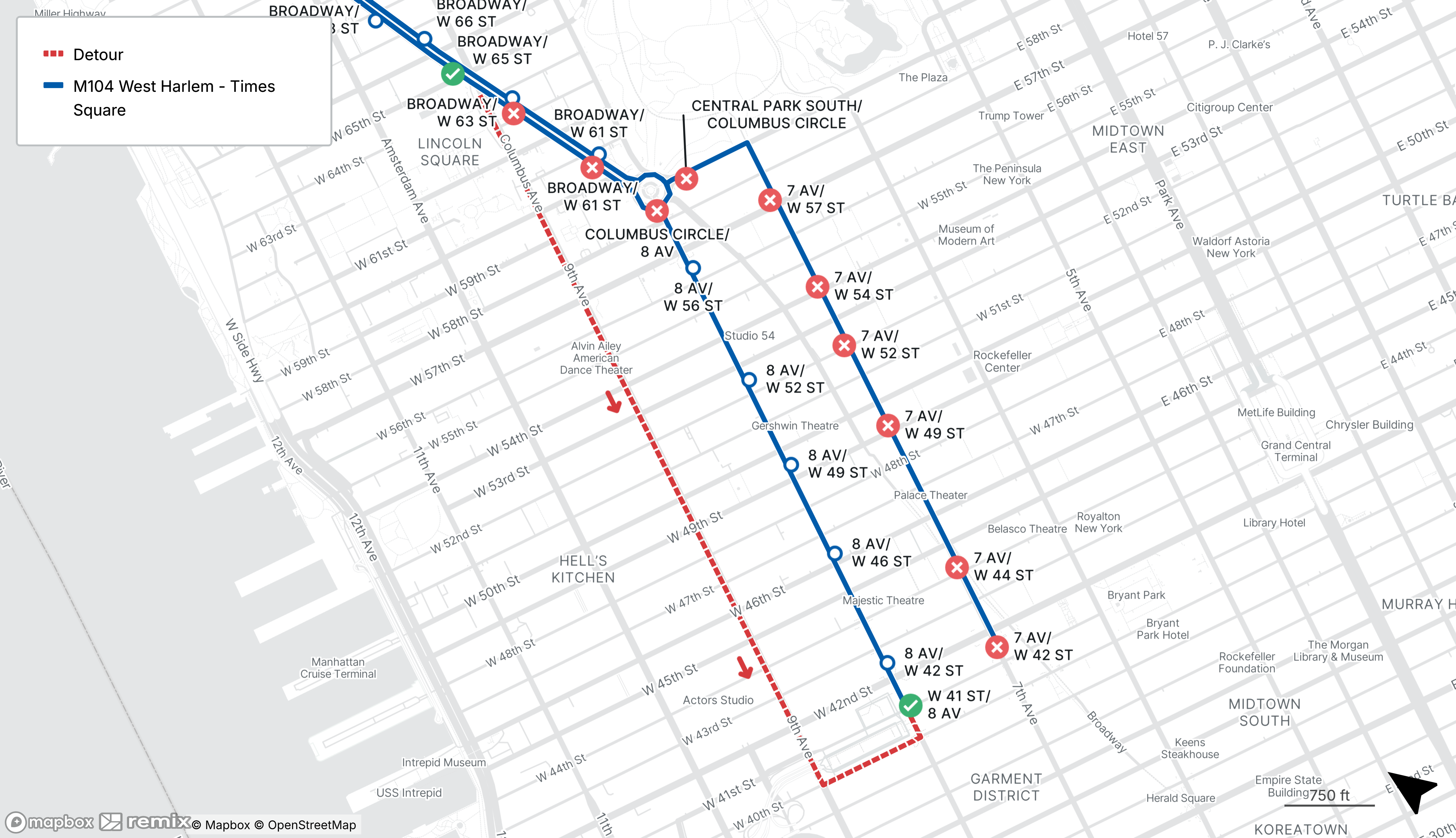 Southbound M104 buses will be detoured from Broadway at W 64th St to 8th Ave at W 42nd St