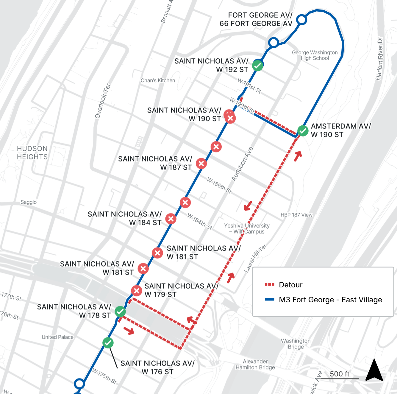 Southbound M1, M2, and M3 stops along 5th Ave from W 72nd St to W 44th St will be closed