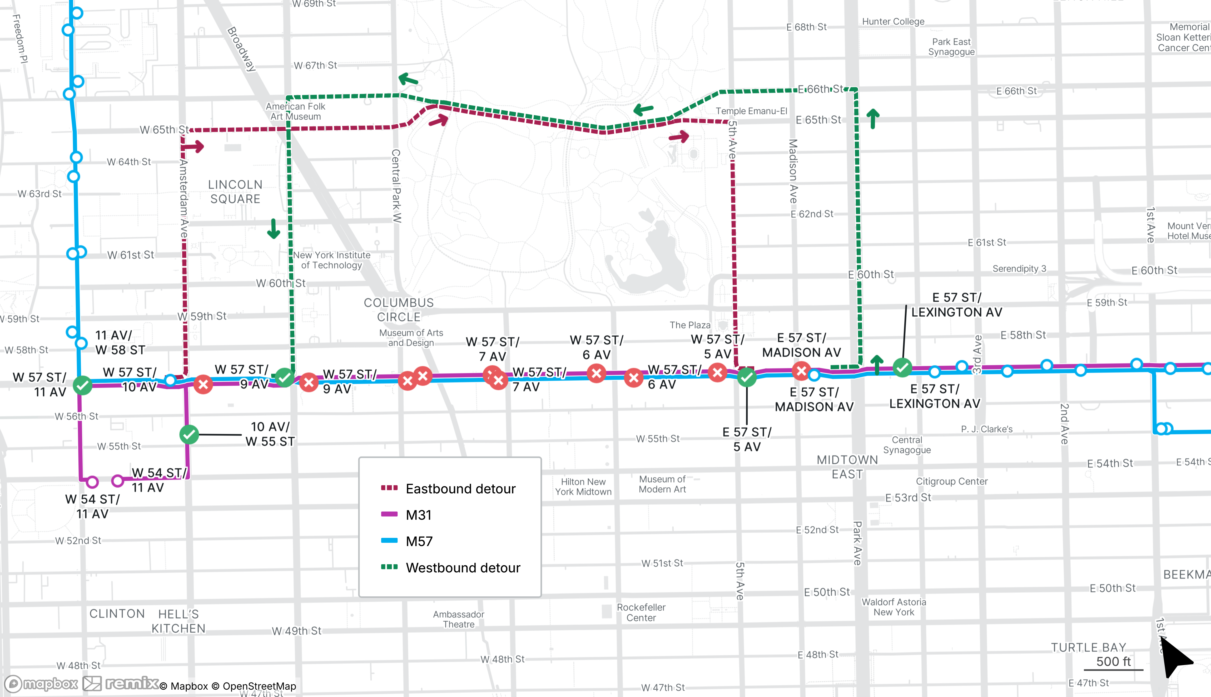 M31 and M57 buses will be detoured between E 57th St at Madison Ave and W 57th St at 10th Ave