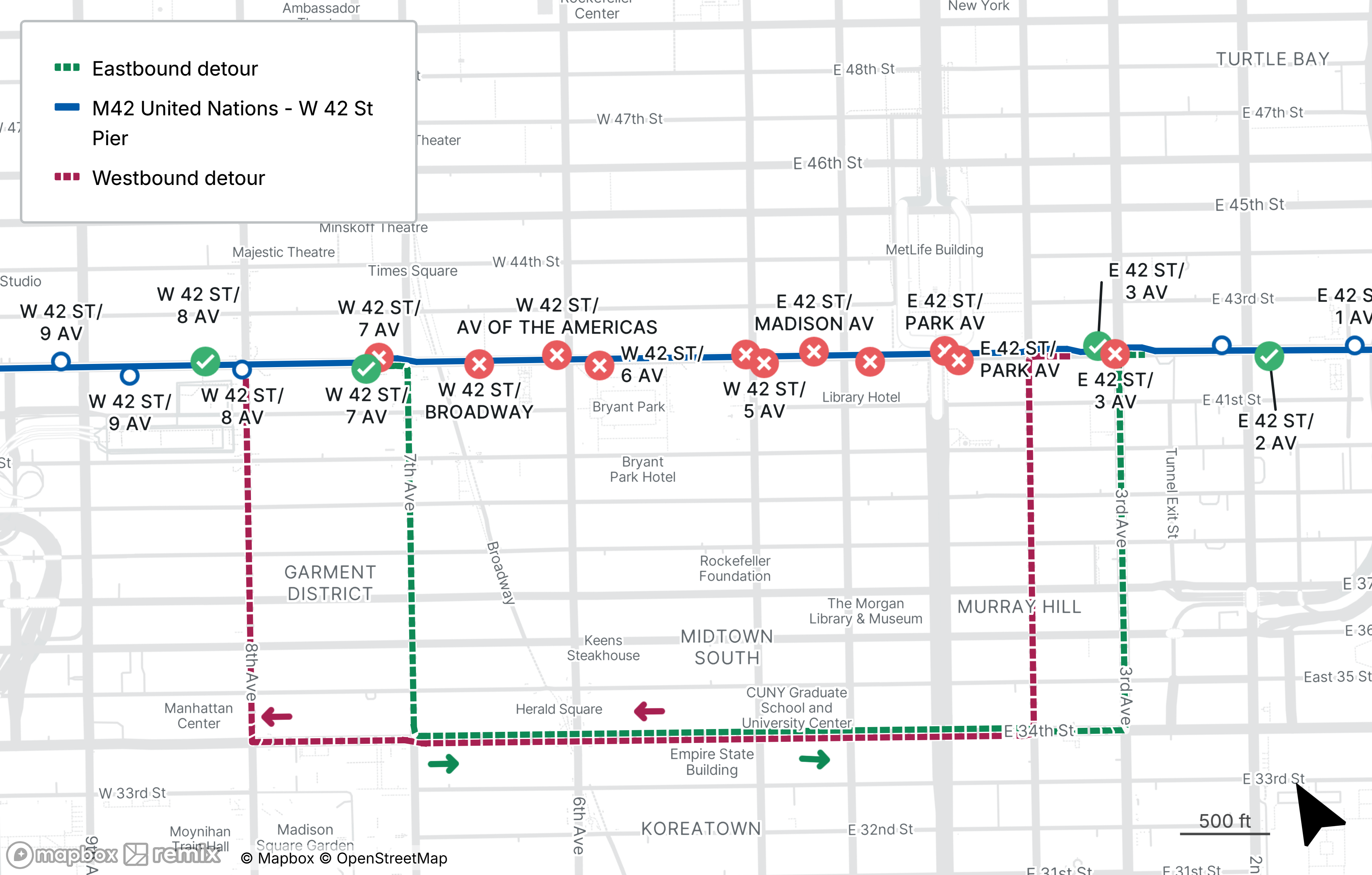 M42 buses will be detoured from 42nd St between Lexington Ave and 7th Ave