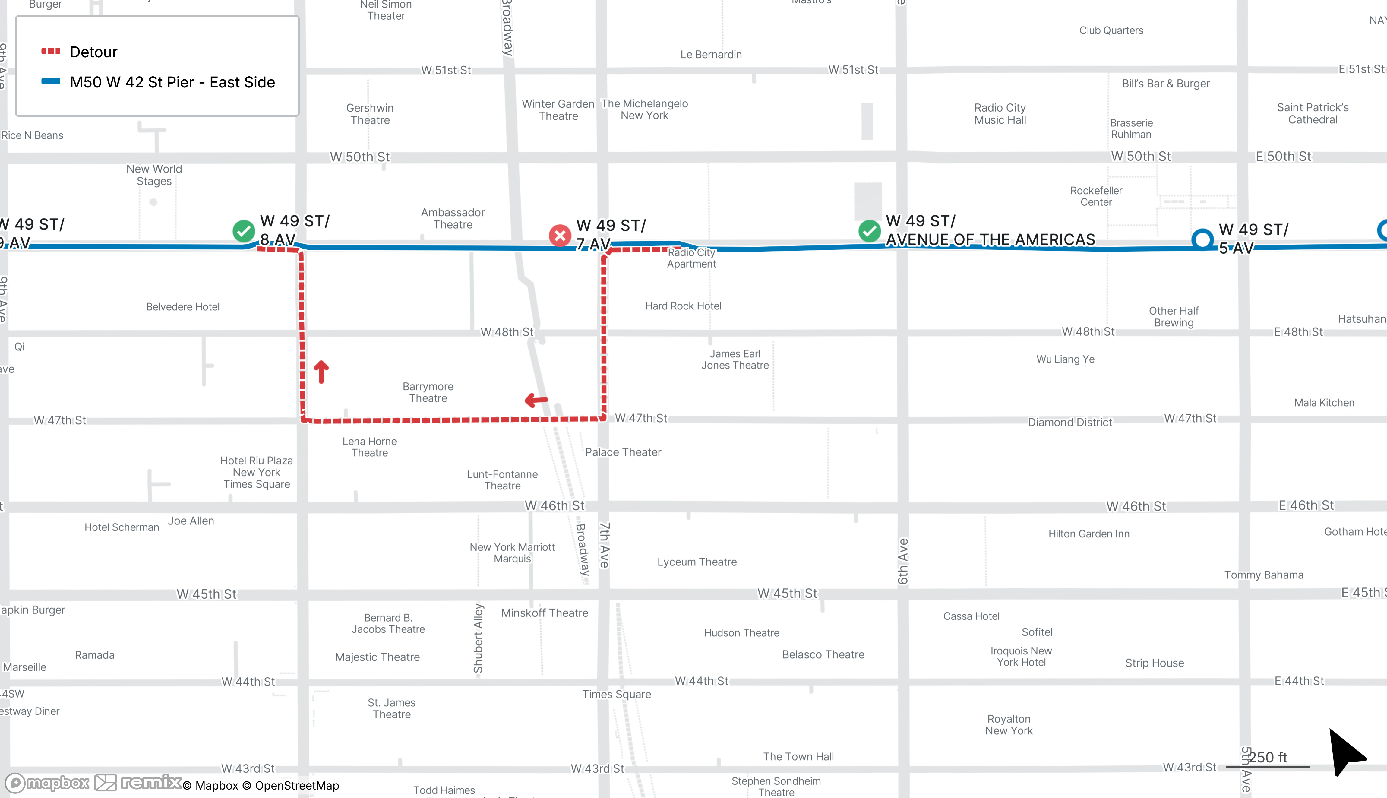 M50 buses will be detoured between W 50th St at 7th Ave and E 49th St at Lexington Ave