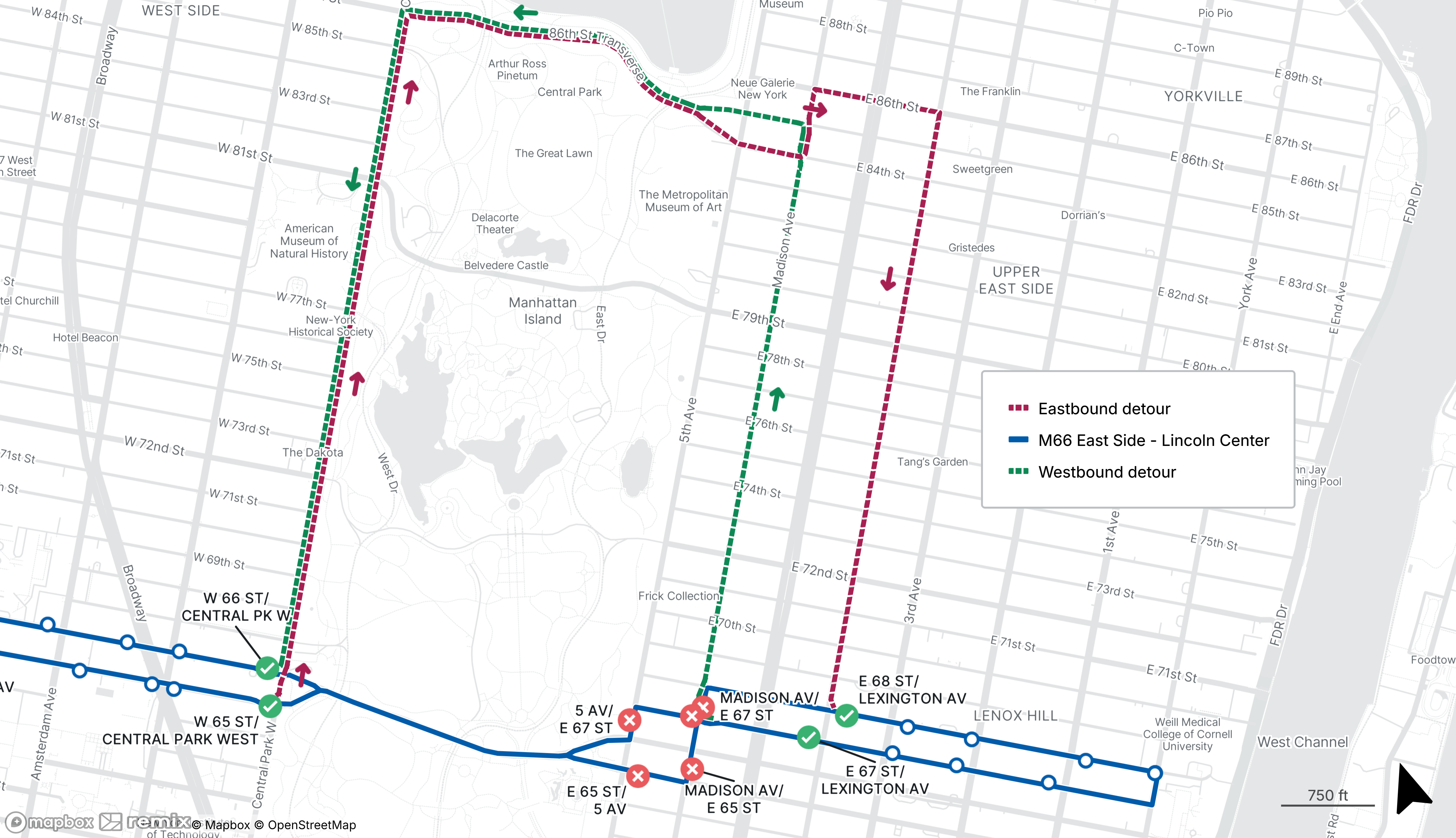 Eastbound M66 stop on Madison Ave at E 67th St will be bypassed, use the stop on E 68th St at Lexington Ave instead
