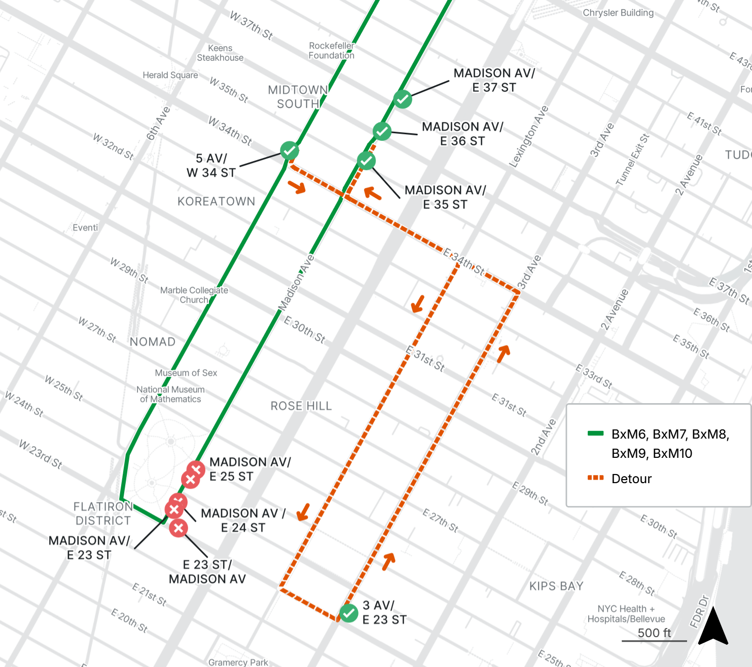 Northbound BxM6, BxM7, BxM8, BxM9, and BxM10 stops on E 23rd St at Madison Ave and along Madison Ave from E 23rd St to E 25th St are closed
