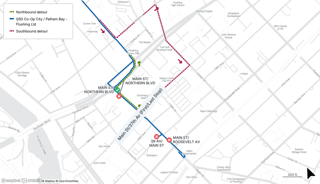 Q50 southbound stops on Main St at Northern Blvd and on 39th Ave at Main St, northbound on Main St at Roosevelt Ave will be closed