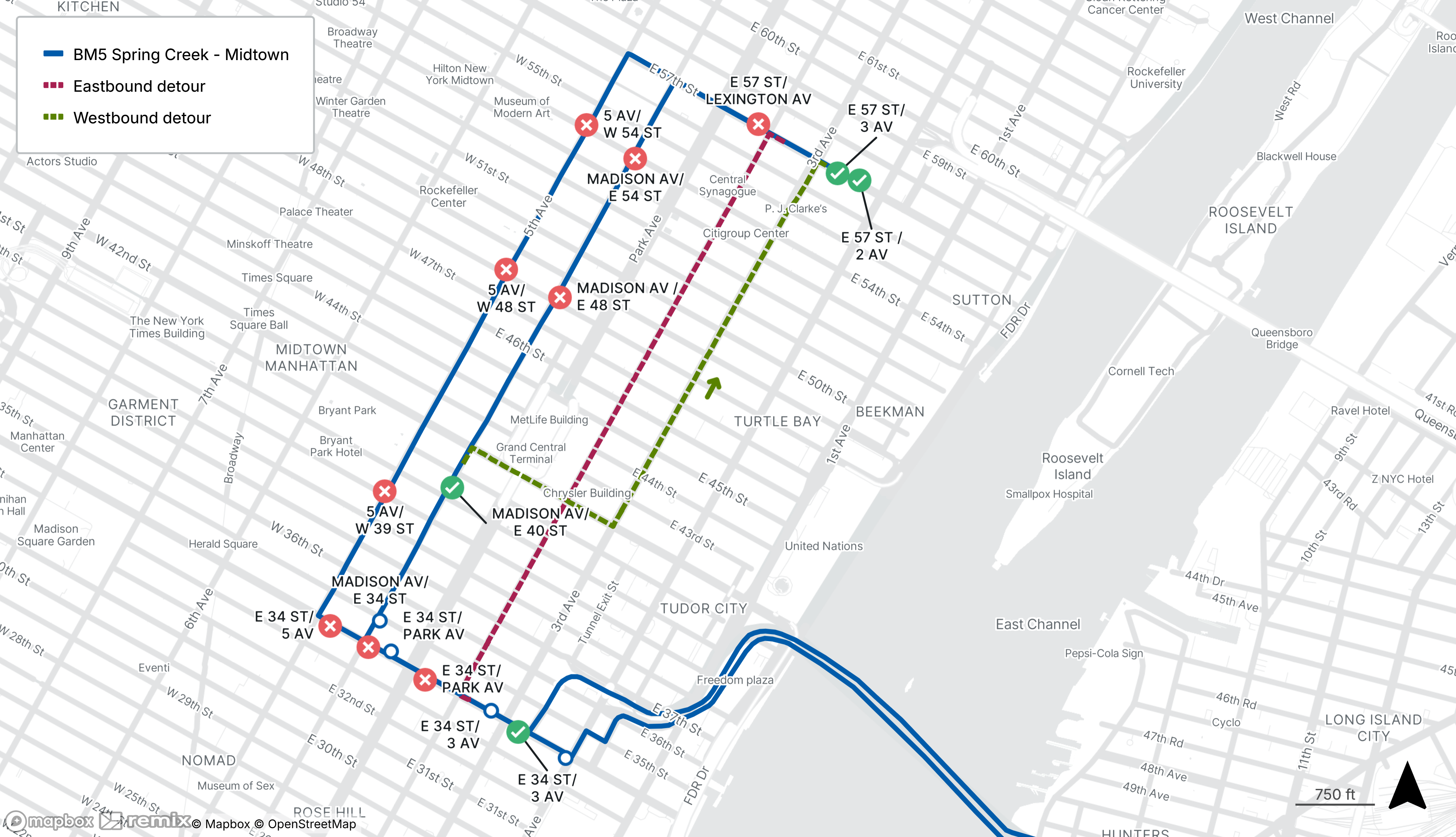 BM5 buses will be detoured between E 57th St at Lexington Ave and Madison Ave at E 42nd St