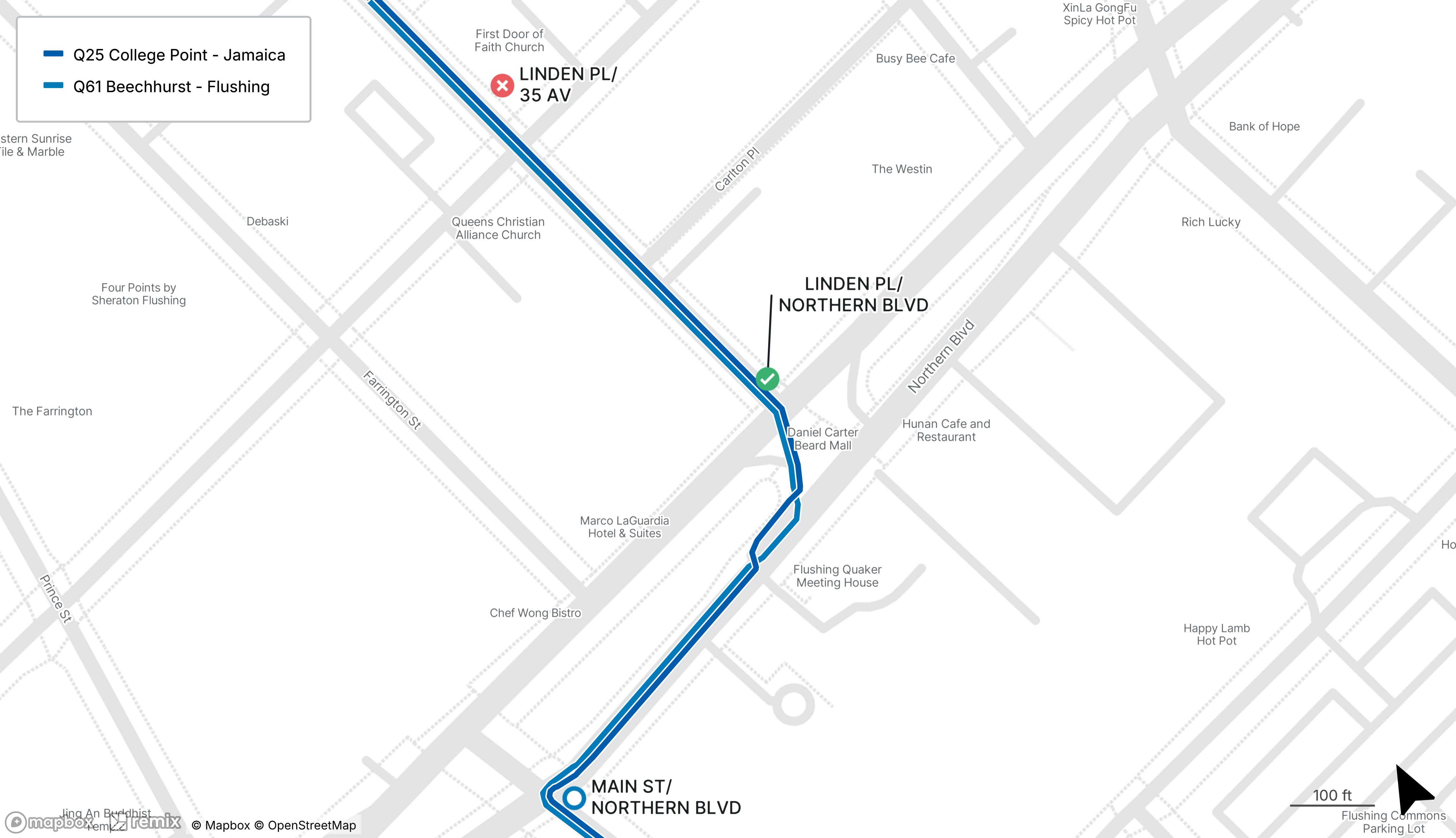 Northbound Q25 stop on Linden Pl at 35th Ave is closed; buses make a stop on Farrington St at 35th Ave instead