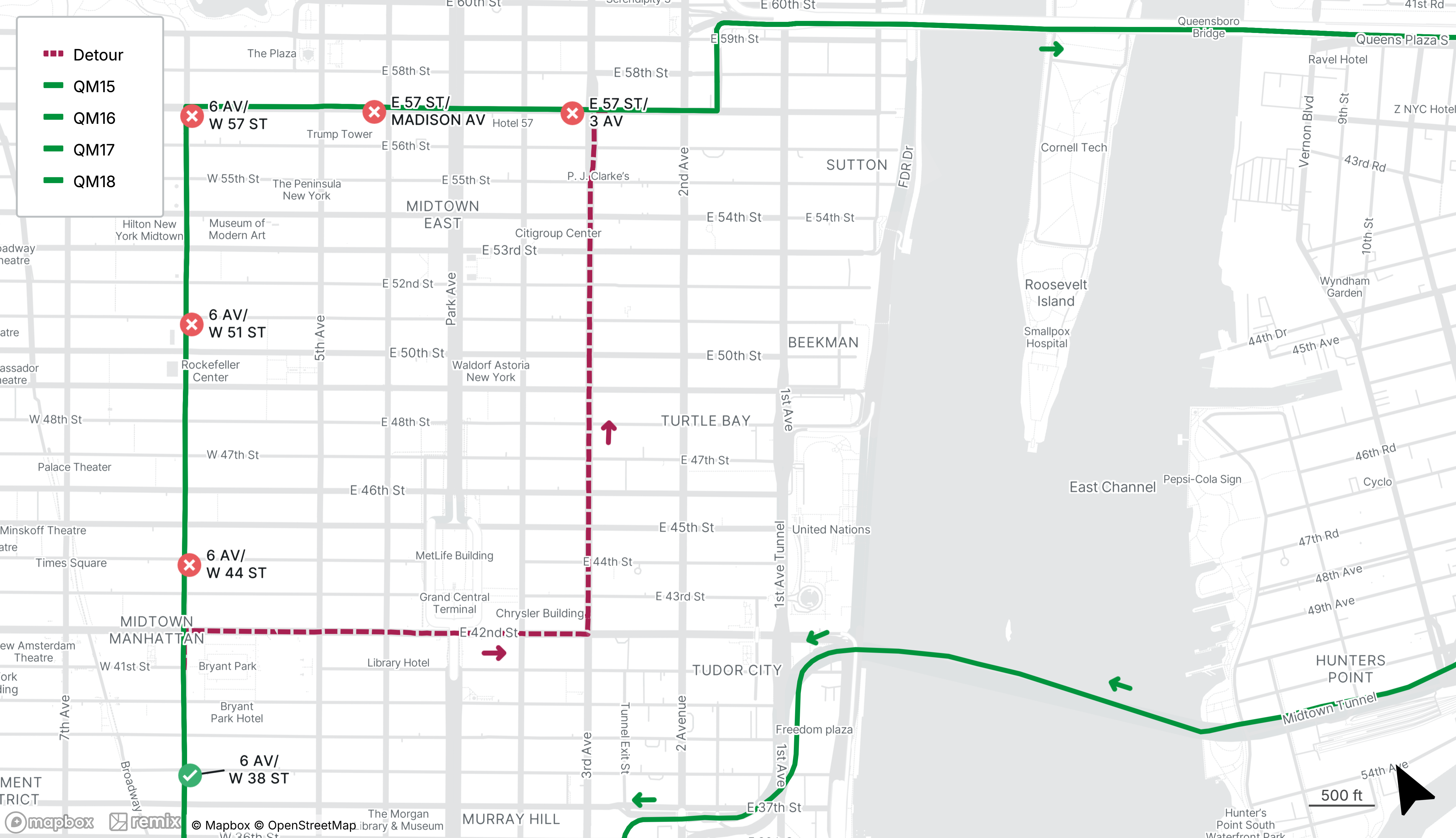 Eastbound QM15, QM16, QM17, QM18 stops on 6th Ave from W 44th St to W 57th St and on E 57th St at Madison Ave and 3rd Ave will be closed