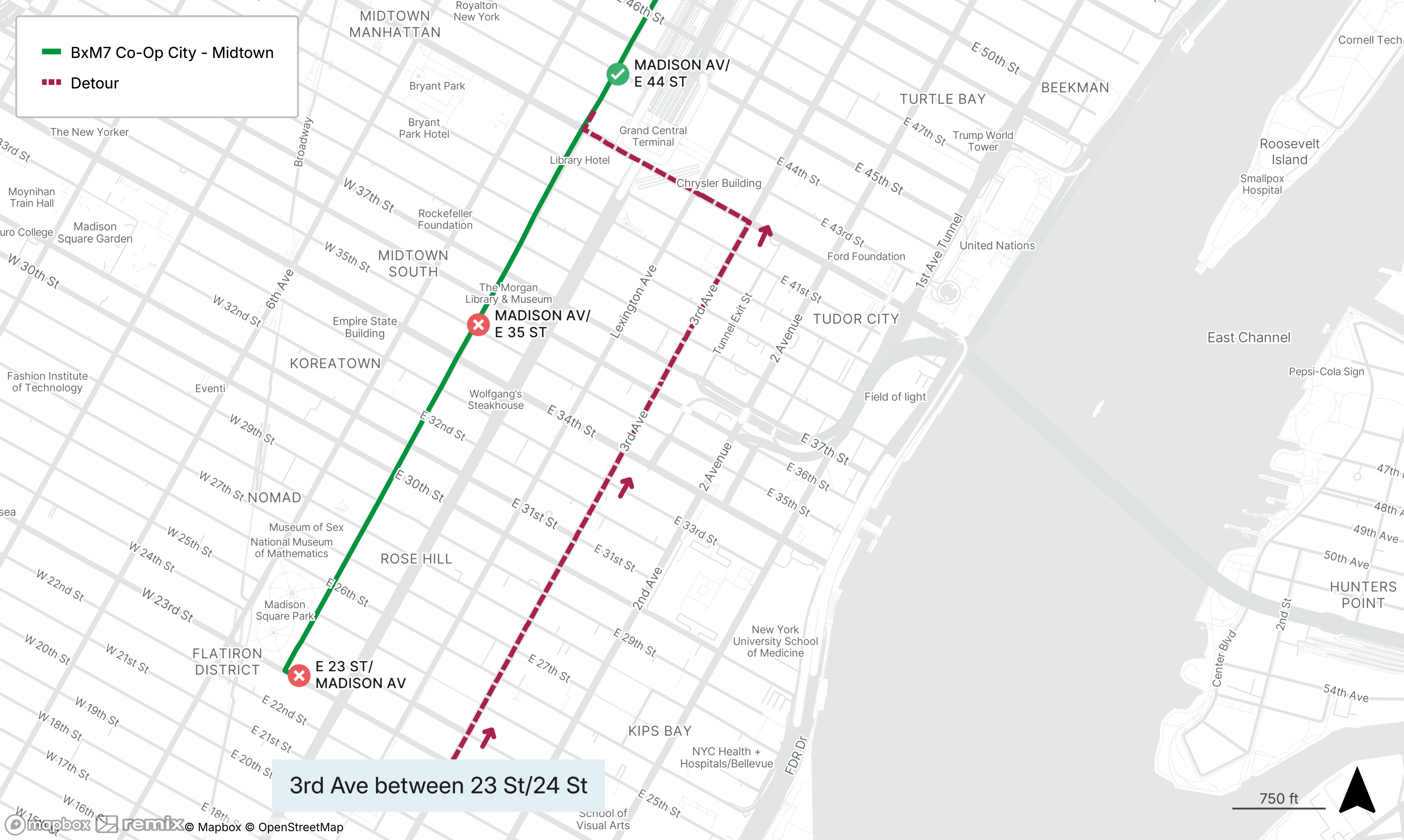 Northbound BxM7 stops on E 23rd St at Madison Ave and Madison Ave at E 35th St will be closed