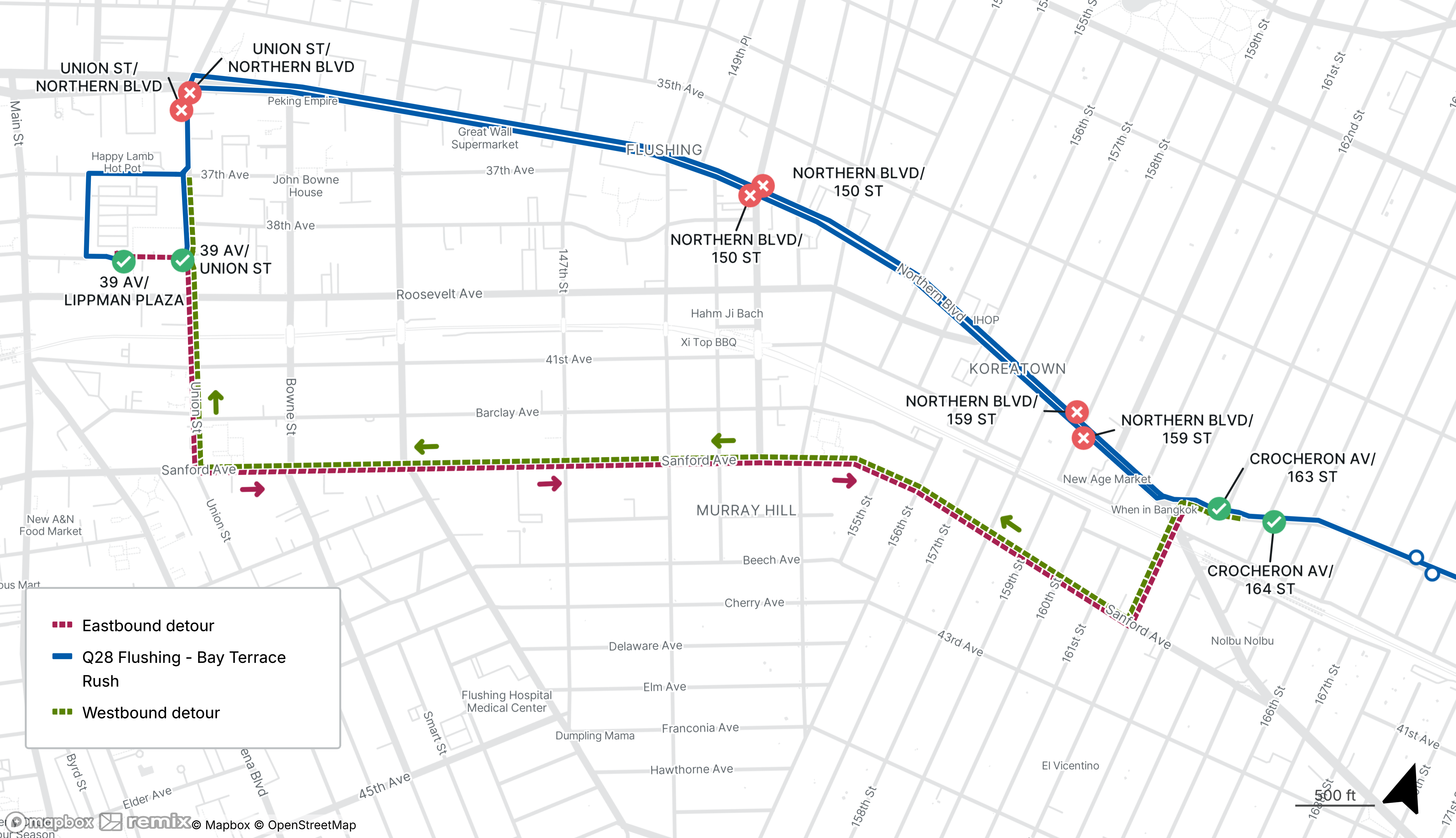 Q28 buses will be detoured between 39th Ave at Union St and Crocheron Ave at 162nd St
