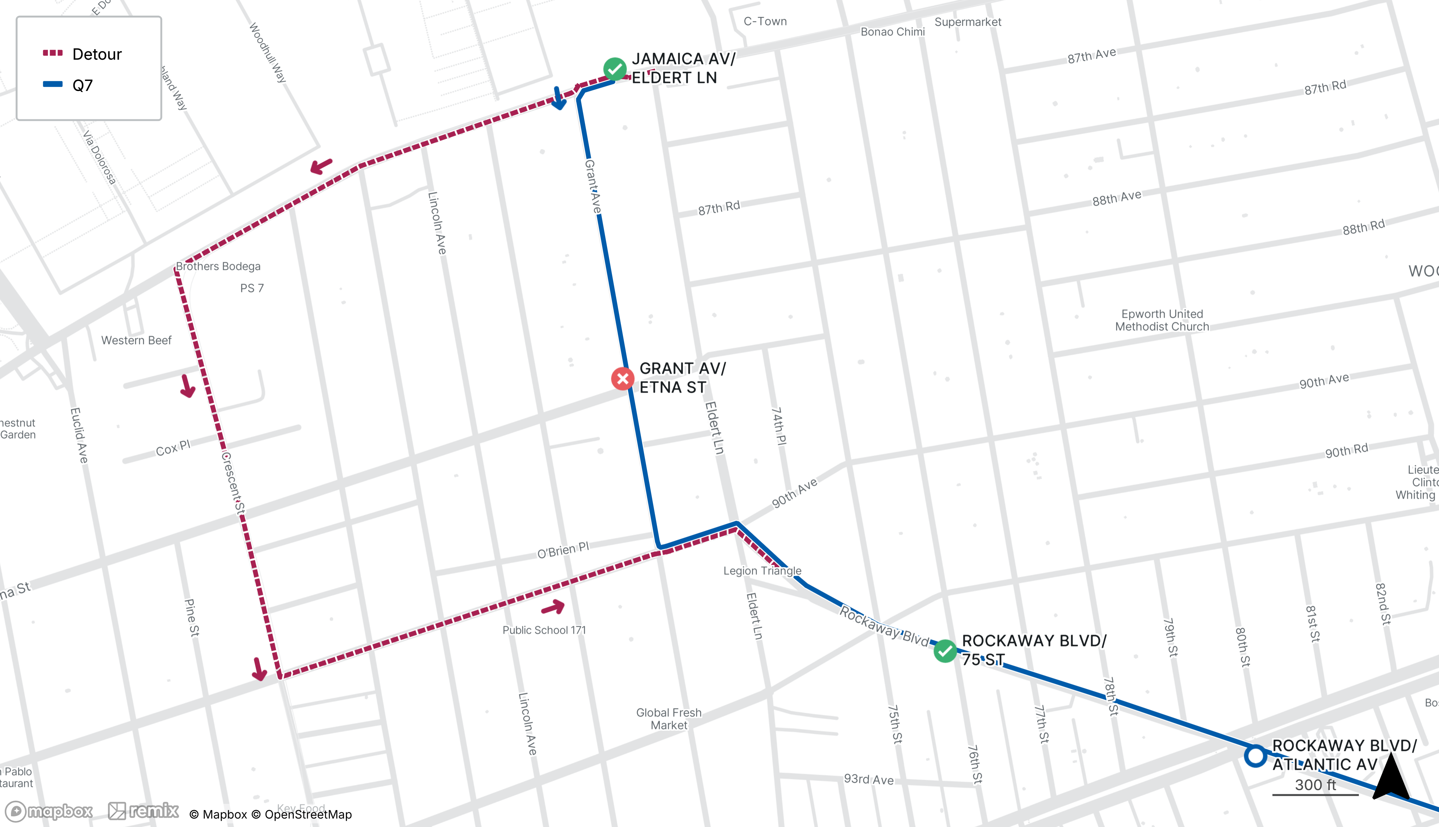 Westbound Q7 stop on Jamaica Ave at Eldert Ln is closed; customers will be dropped off on Eldert Ln at 87th Ave instead