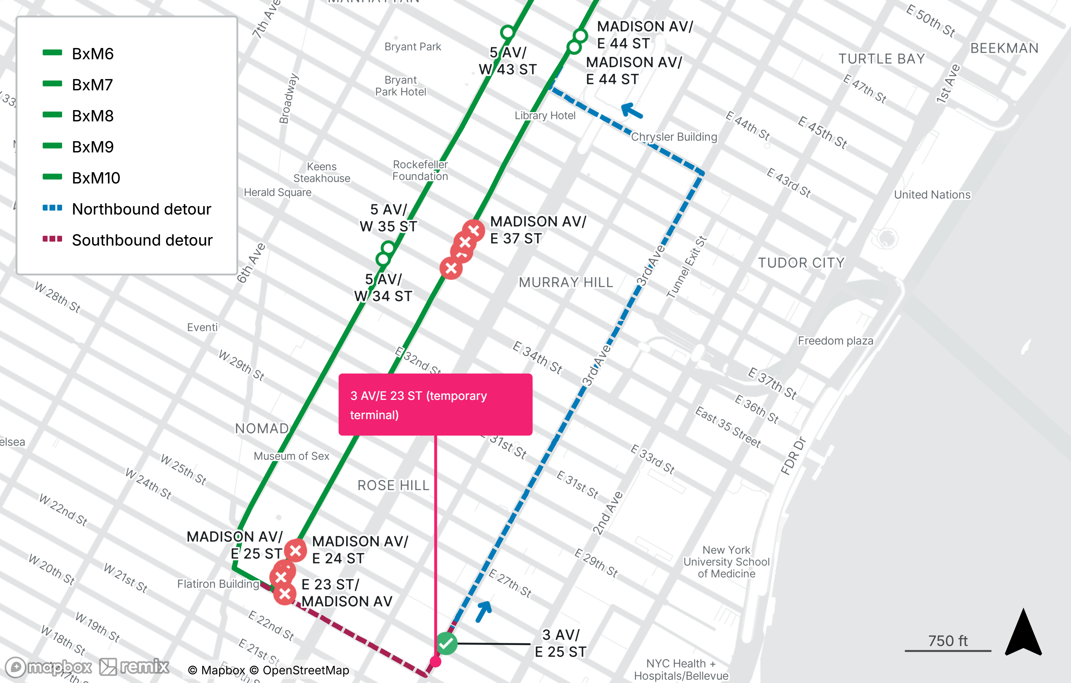 BxM6, BxM7, BxM8, BxM9, and BxM10 buses will be detoured between 3rd Ave at E 23rd St and E 42nd St at Madison Ave