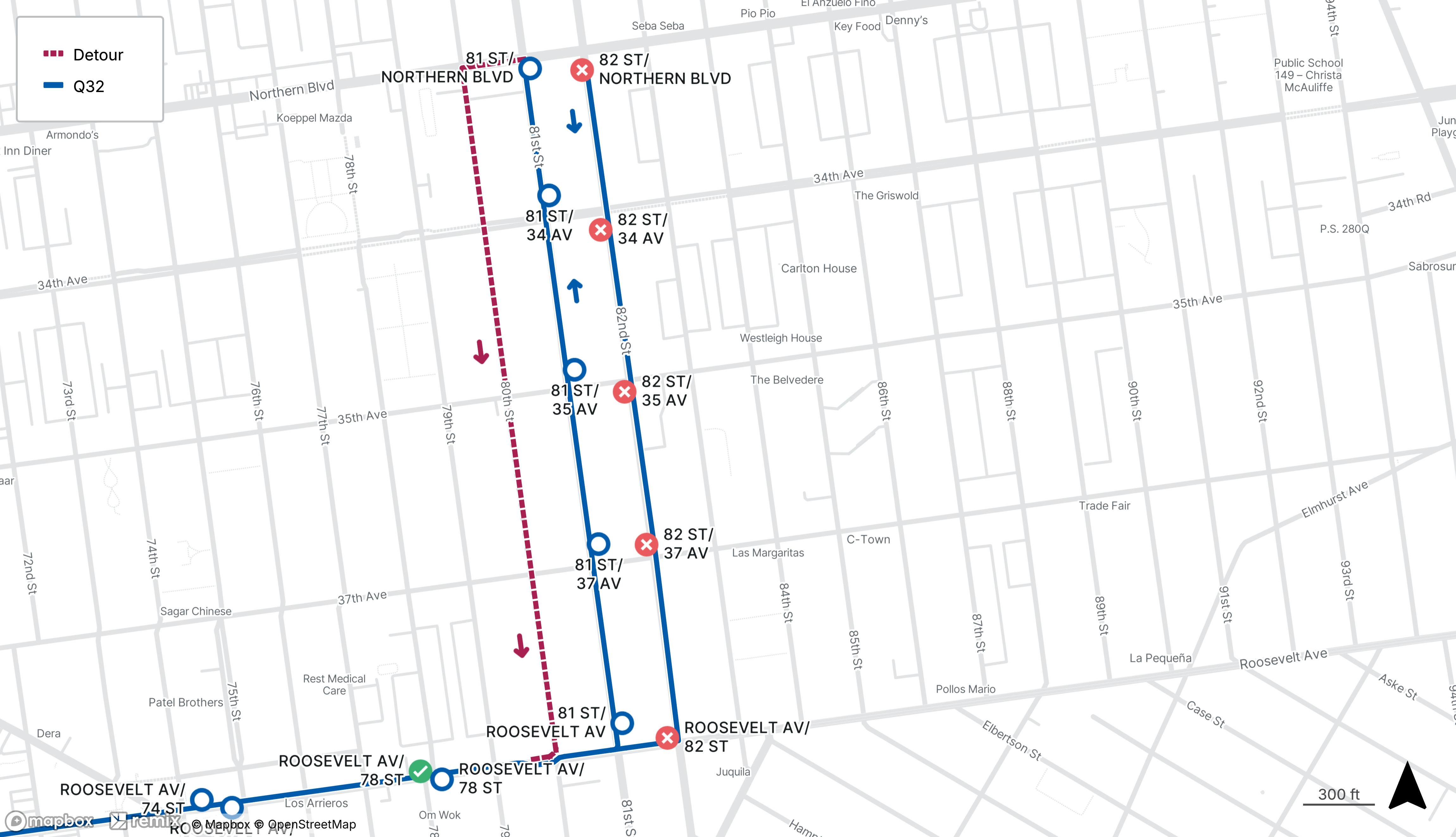 Westbound Q32 stops on 82nd St from Northern Blvd to 37th Ave and Roosevelt Ave at 82nd St will be closed