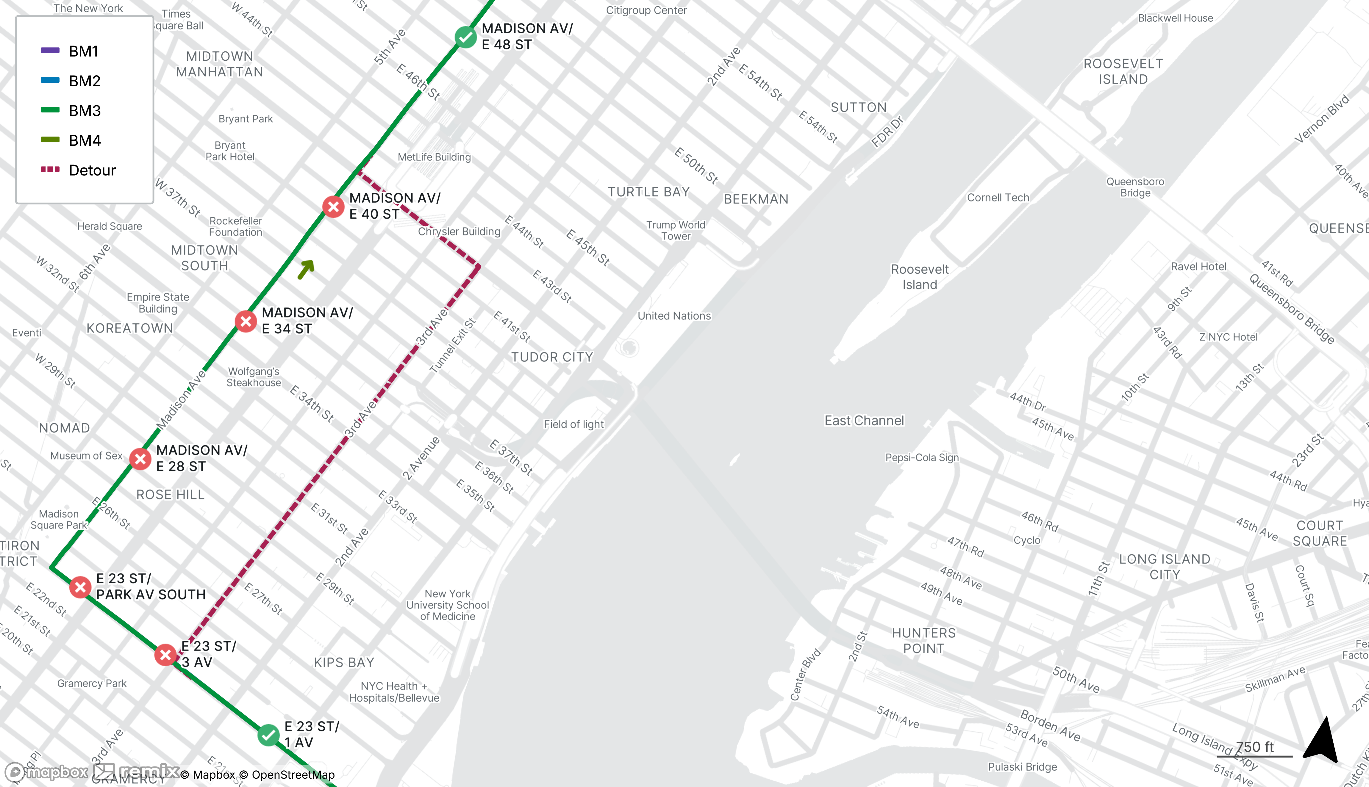 BM1, BM2, BM3, and BM4 stops on E 23rd St at 3rd Ave and Park Ave South and on Madison Ave from E 28th St to E 40th St will be closed
