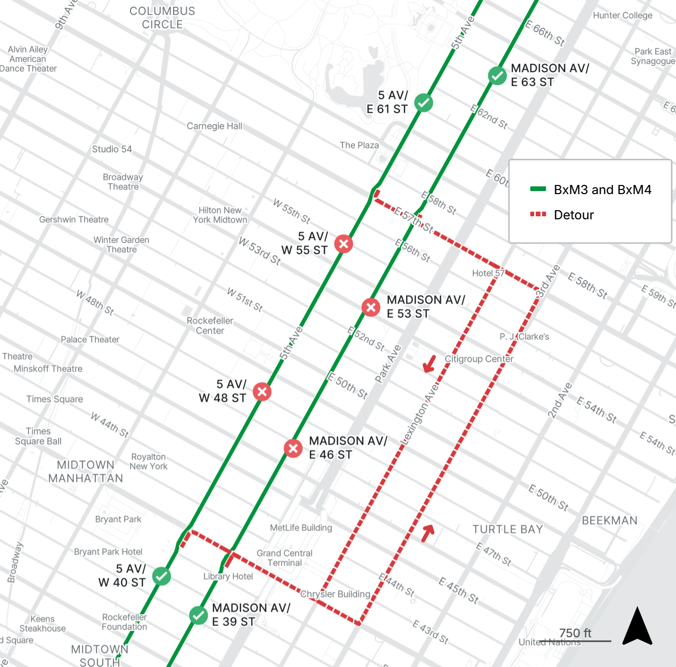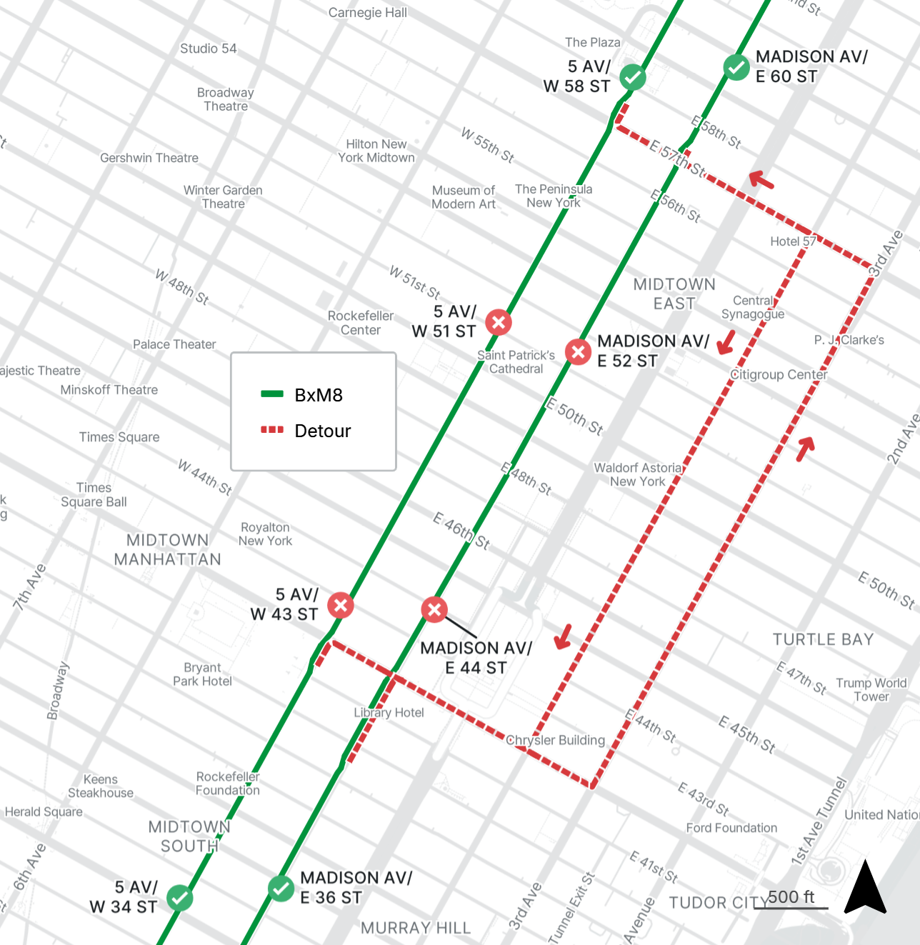 BxM8 northbound stops on Madison Ave at E 44th St and E 52nd St, and southbound stops on 5th Ave at W 51st St and W 43rd St are closed