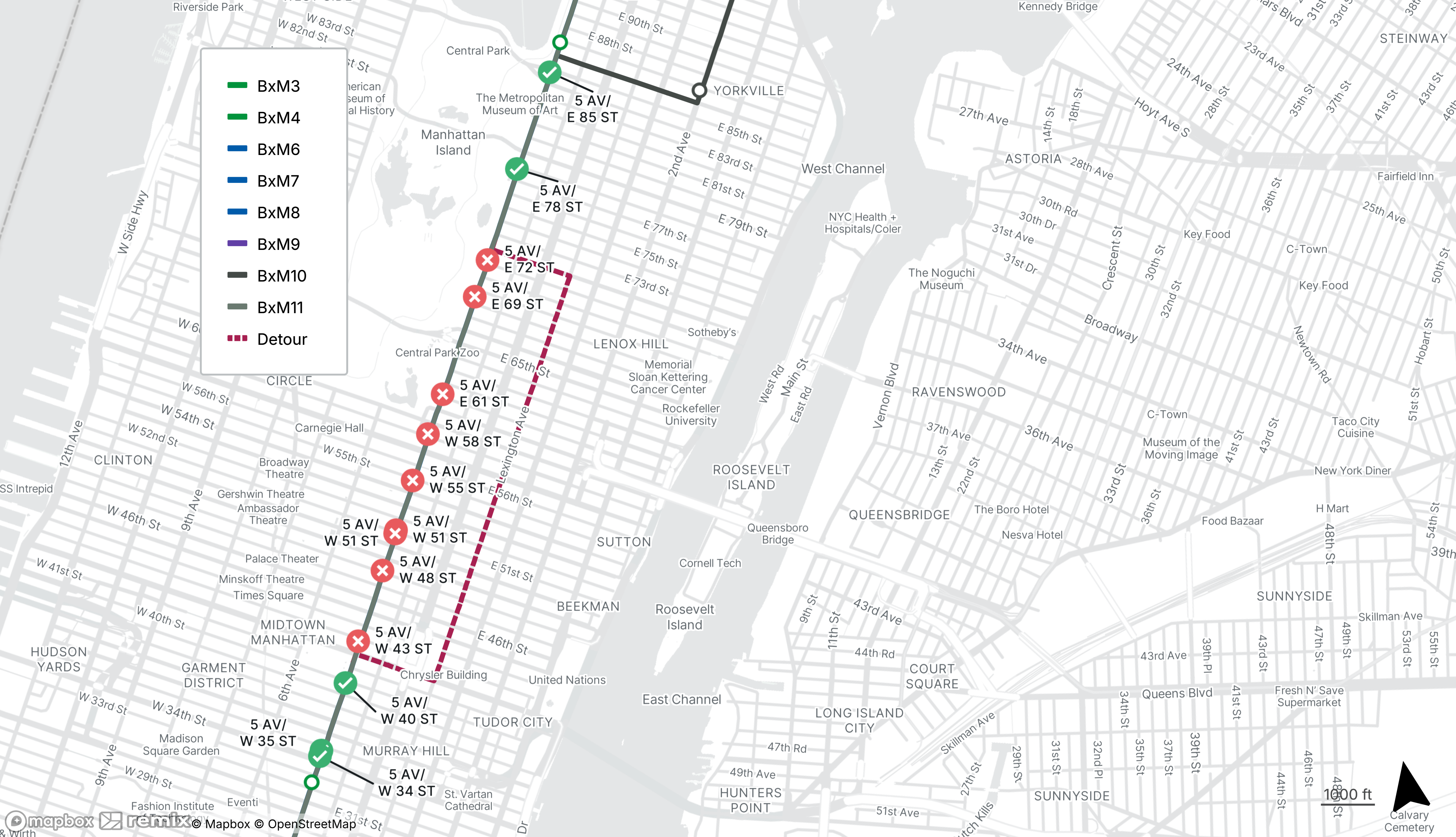For BxM10 and BxM11 service, use the stops on 5th Ave at E 85th St or W 35th St.