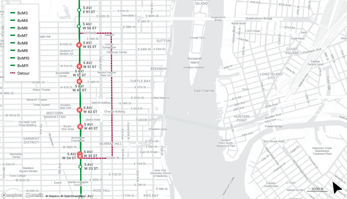 BxM6, BxM7, BxM8, BxM9, and BxM10 buses will be detoured between 3rd Ave at E 23rd St and E 42nd St at Madison Ave