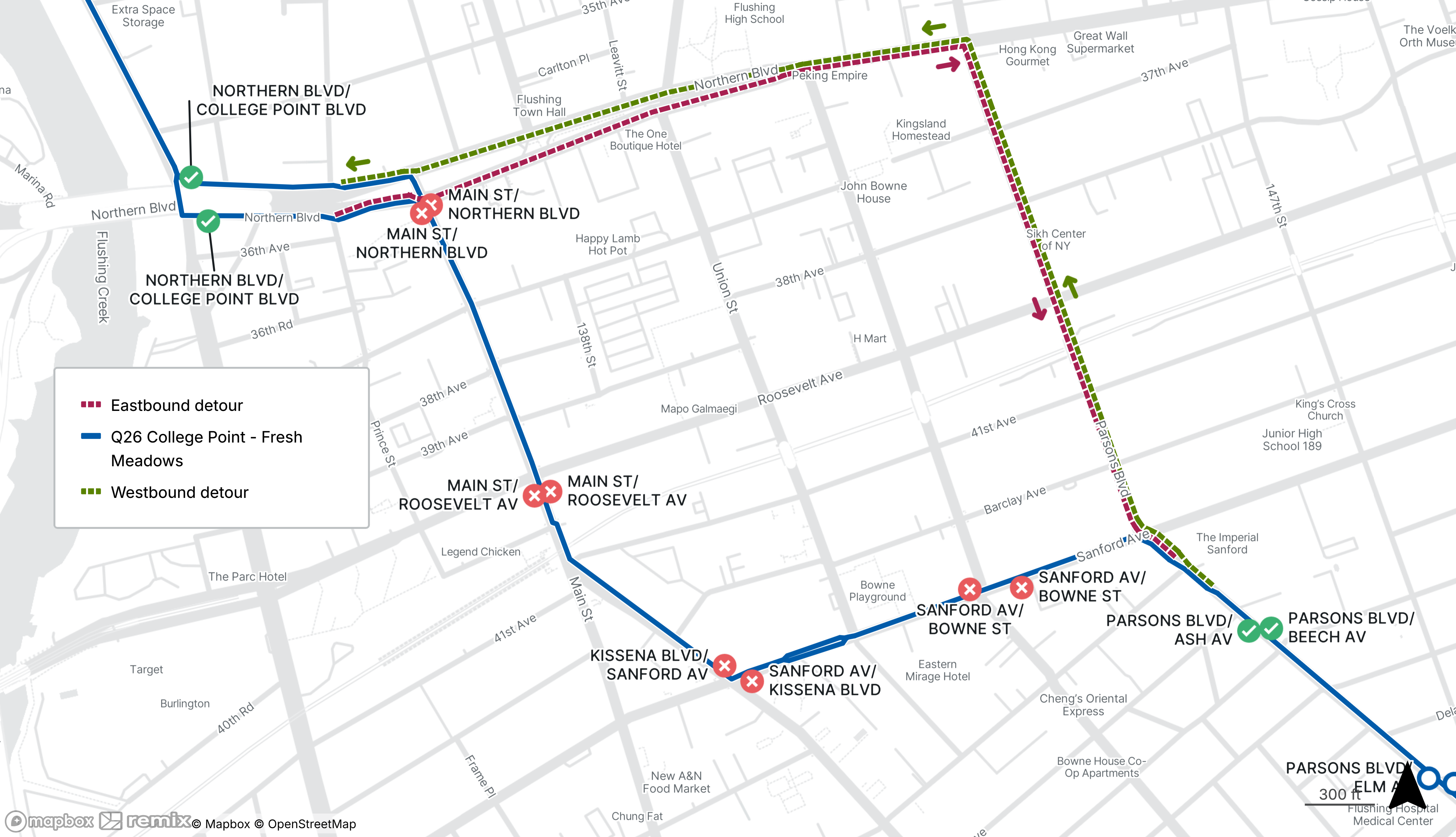 Starts Sat Feb 21 Until Sat Feb 21For eastbound service, use the stops on Northern Blvd at College Point Blvd or Parsons Blvd at Ash Ave.