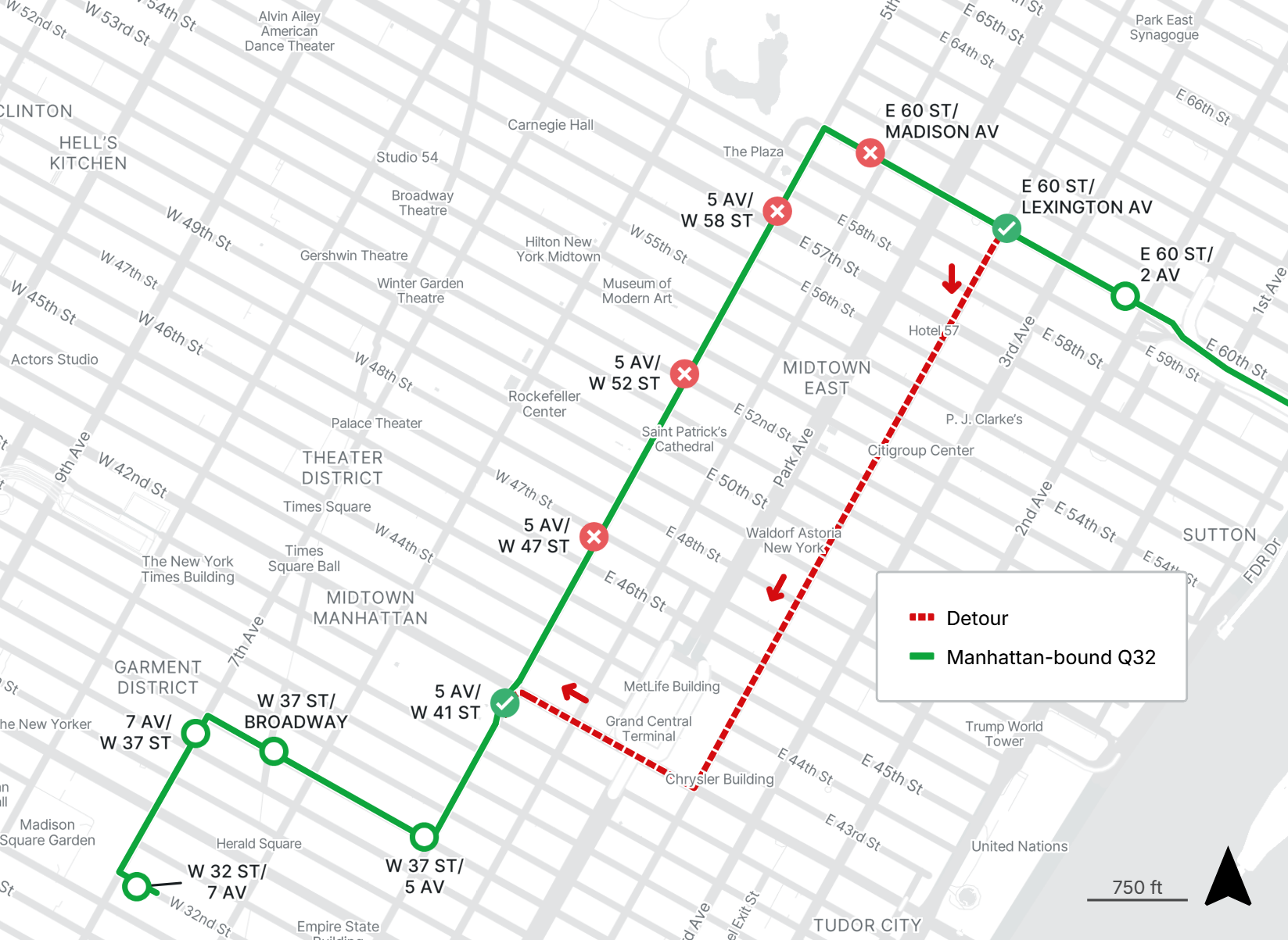 Manhattan-bound Q32 stops on E 60th St at Madison Ave and along 5th Ave from W 58th St to W 47th St are closed