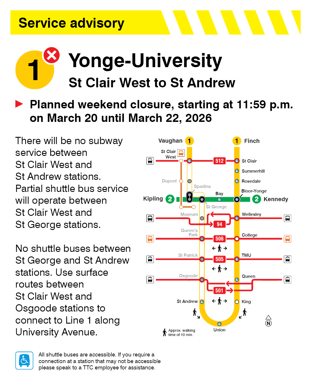 This weekend, there will be no subway service on Line 1 Yonge-University between St Clair West and St Andrew stations due to planned track work. Shuttle buses will operate between St Clair West and St George. Started Fri Mar 20 Until Mon Mar 23 (Updated )