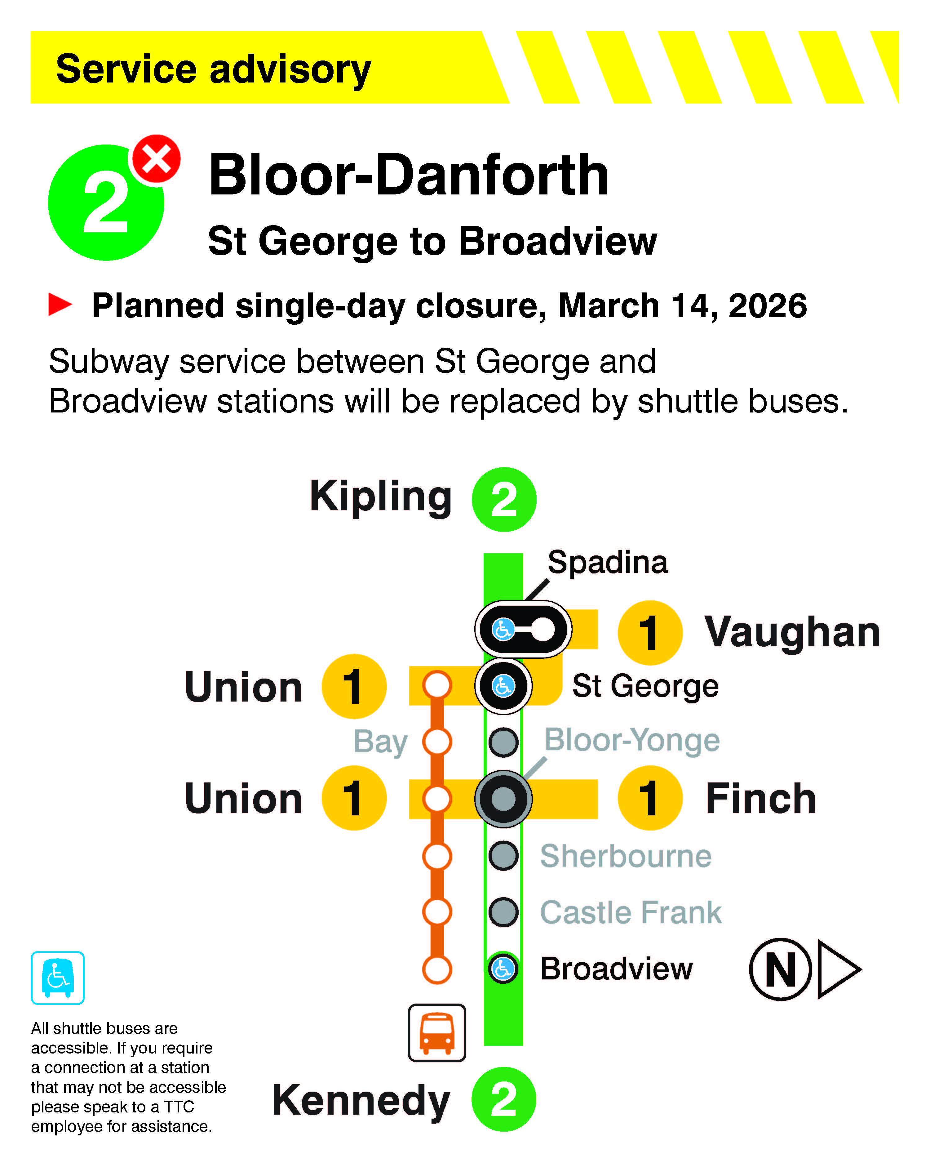 Line 2 Bloor-Danforth: On Saturday, March 14, there will be no subway service between St George and Broadview stations, due to planned track work. Shuttle buses will operate. Regular subway service will resume the following morning at 5 a.m.