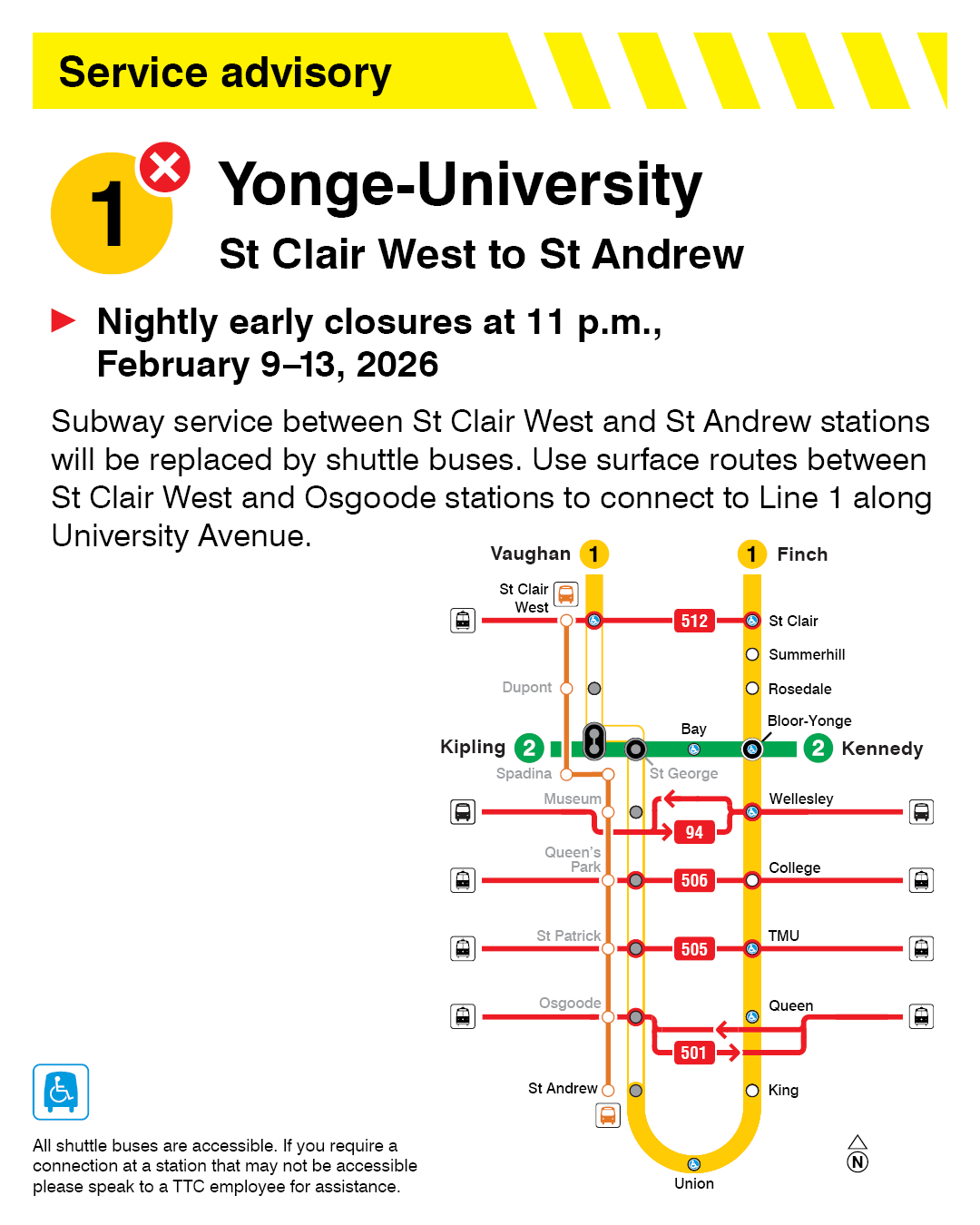 Line 1 Yonge-University: There will be no subway service between St Clair West and St Andrew stations, starting 11 p.m., nightly Monday, February 9 to Friday, February 13, due to planned station work. Shuttle buses will operate.