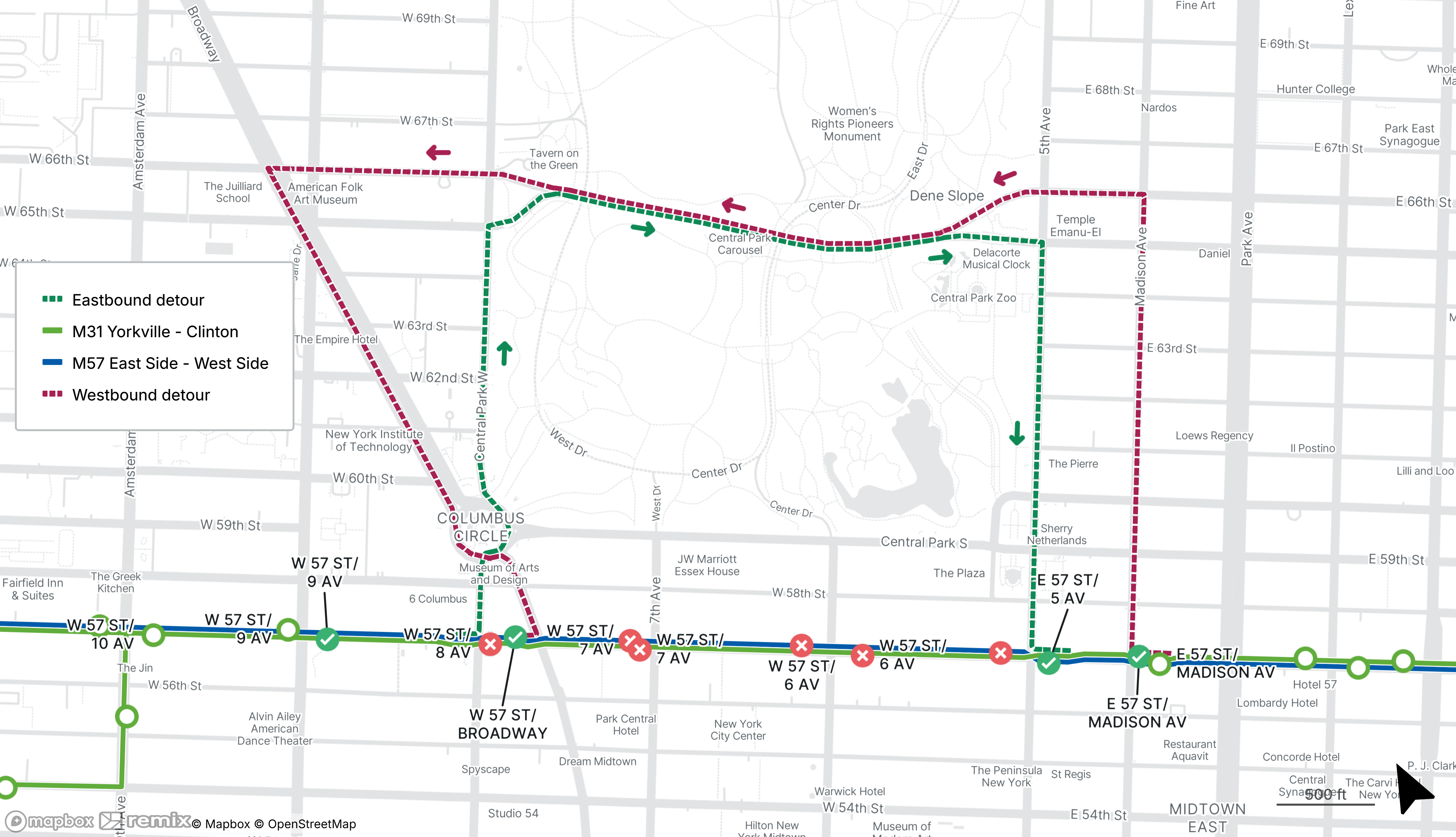 M31 and M57 buses will be detoured from 57th St between Madison Ave and 8th Ave