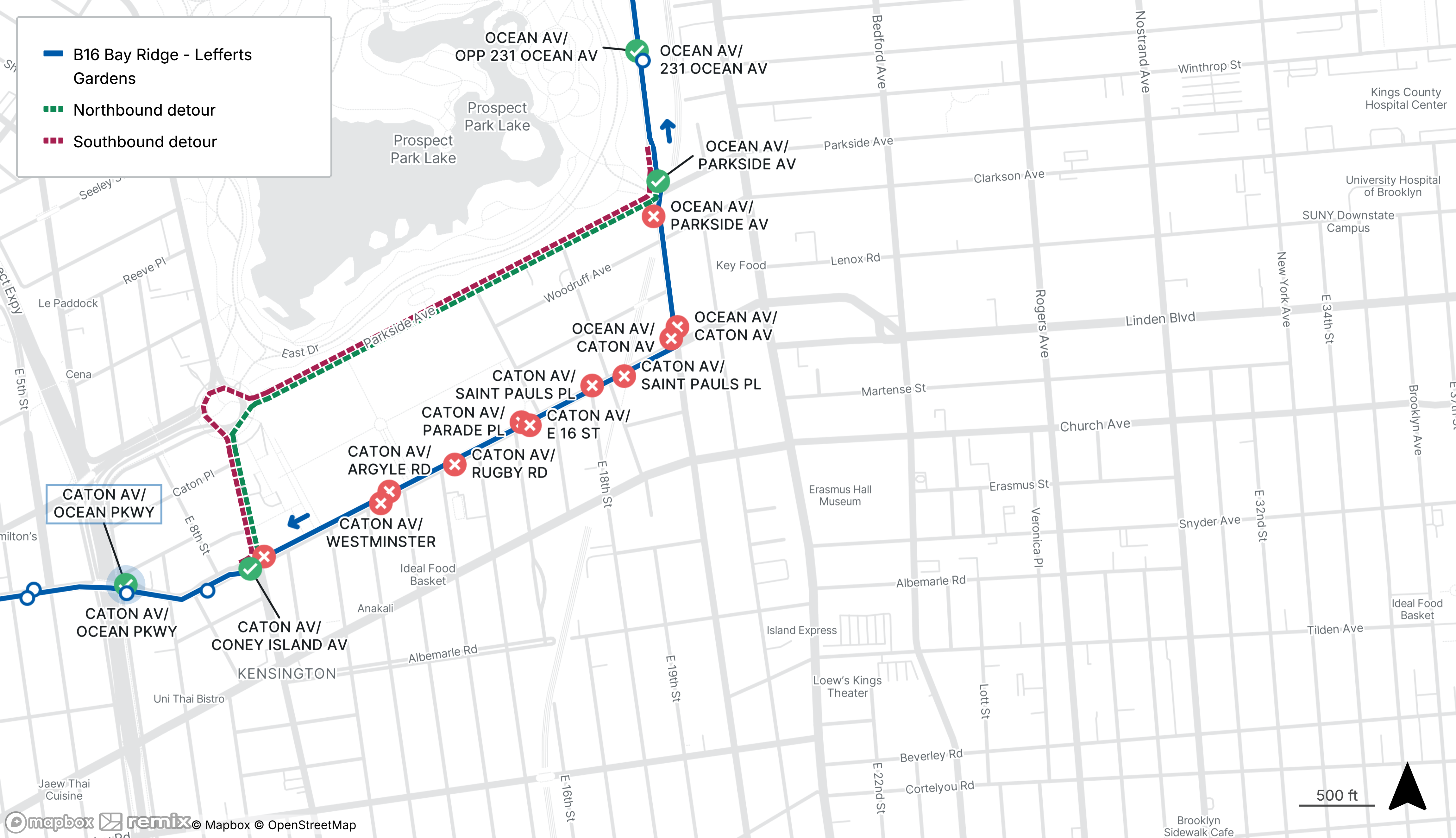 B16 buses will be detoured between Ocean Ave at Parkside Ave and Caton Ave at Coney Island Ave