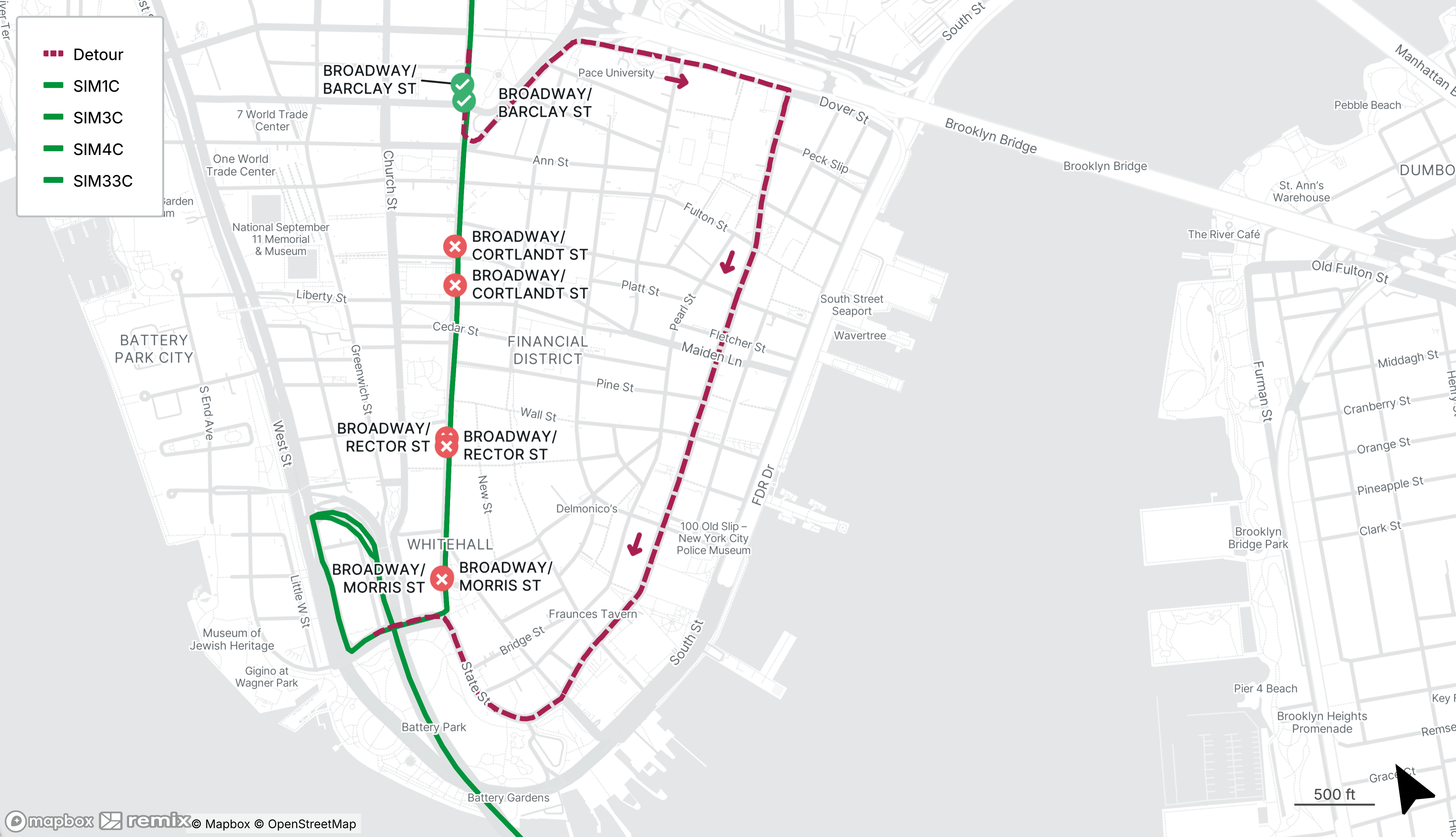 Southbound SIM1C, SIM3C, SIM4C and SIM33C stops on Broadway from Cortlandt St to Morris St will be closed