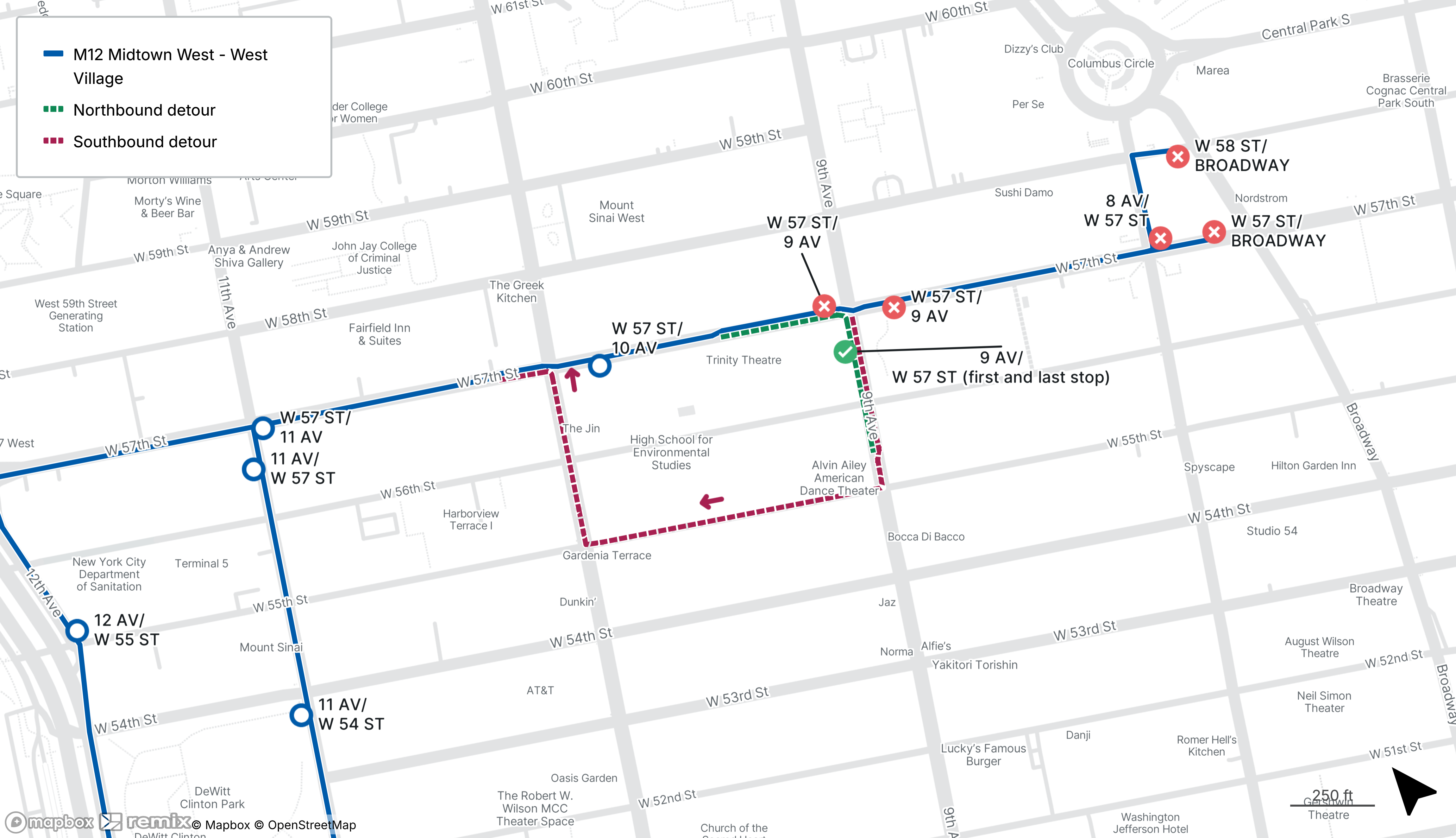 M12 buses will be detoured between 9th Ave at W 57th St and 10th Ave at W 57th St