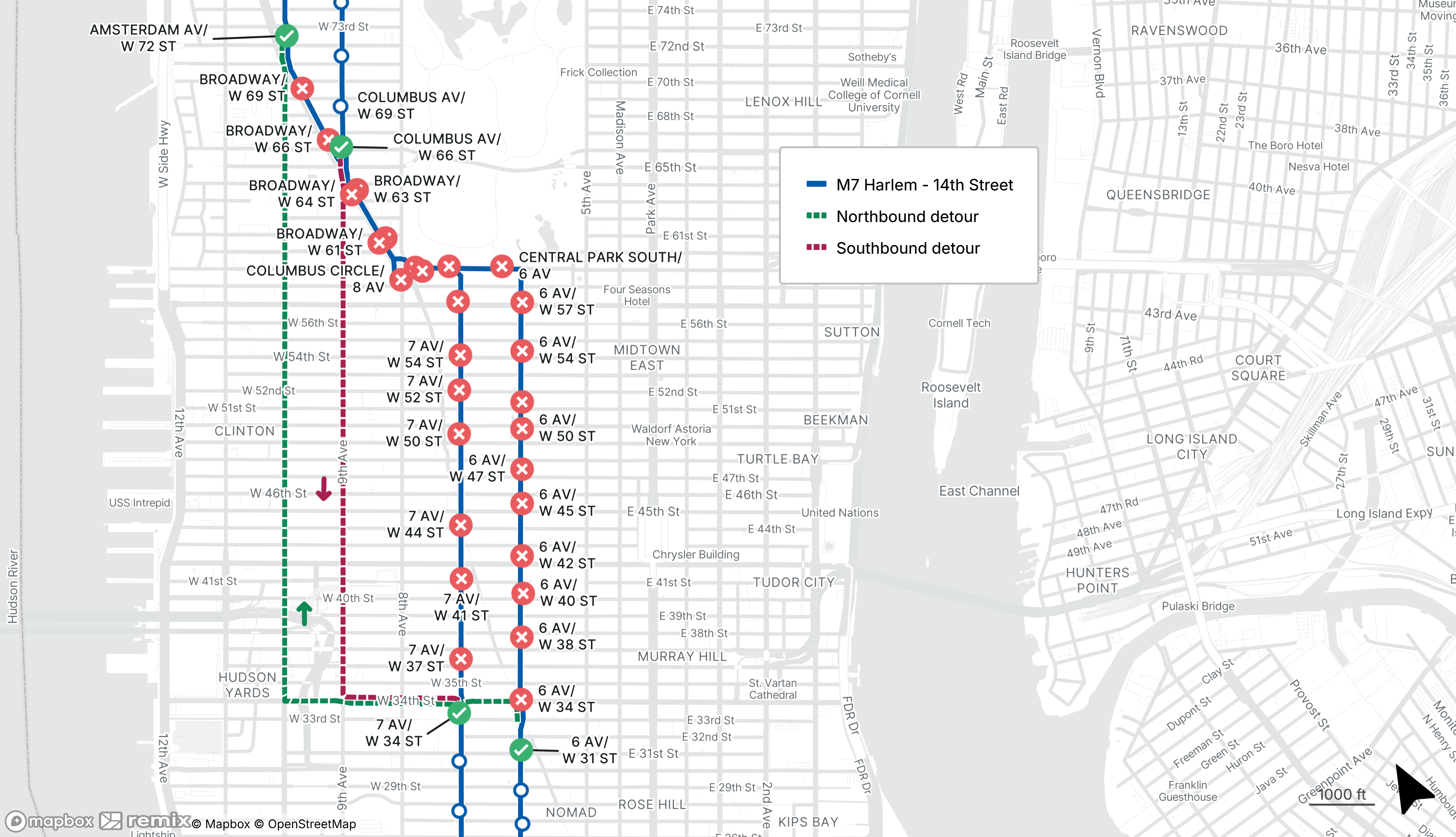 M7 buses will be detoured between Columbus Ave at W 65th St and 6th Ave at W 34th St