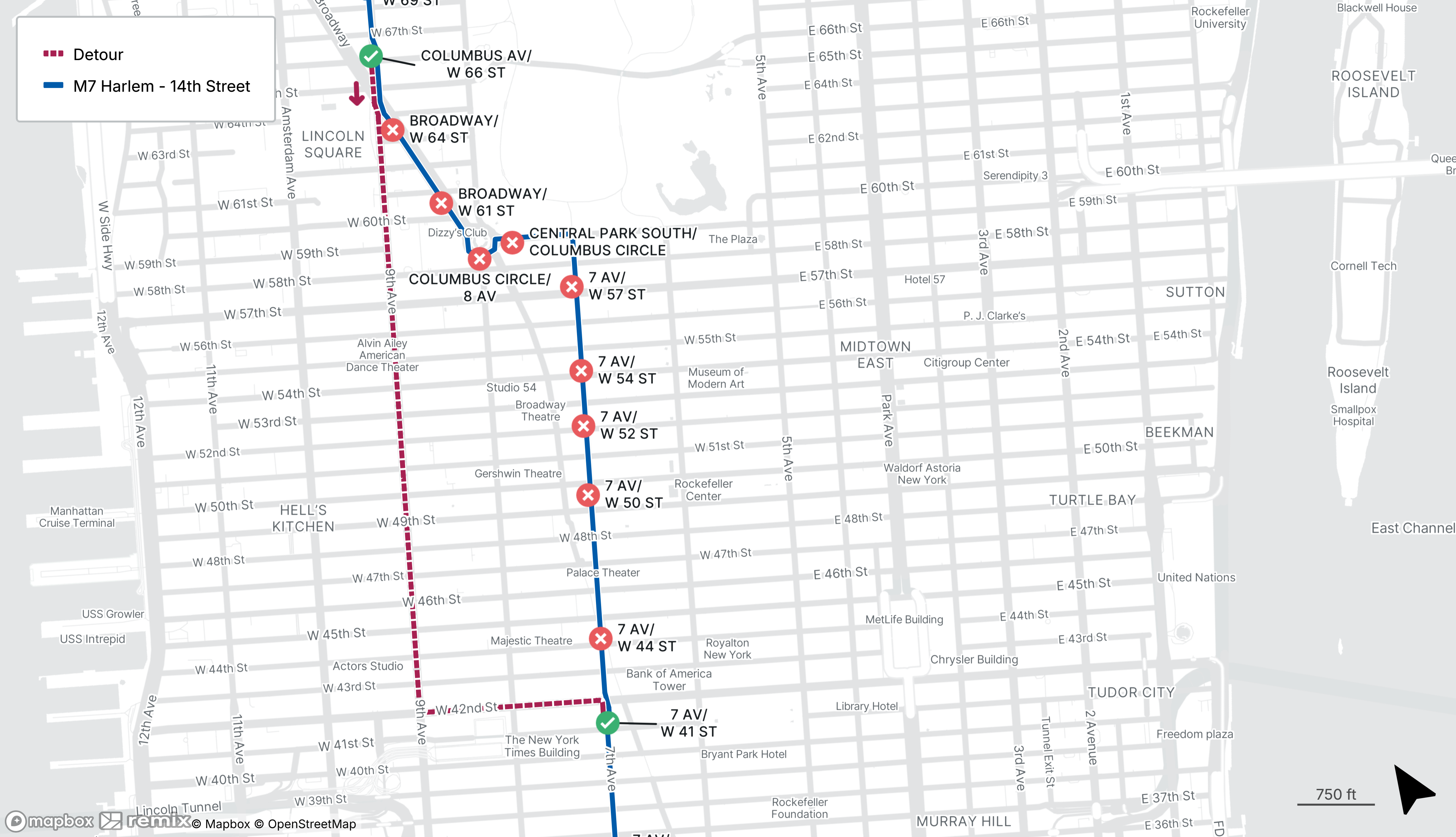 Southbound M7 buses will be detoured from Columbus Ave at W 65th St to W 42nd St at 7th Ave