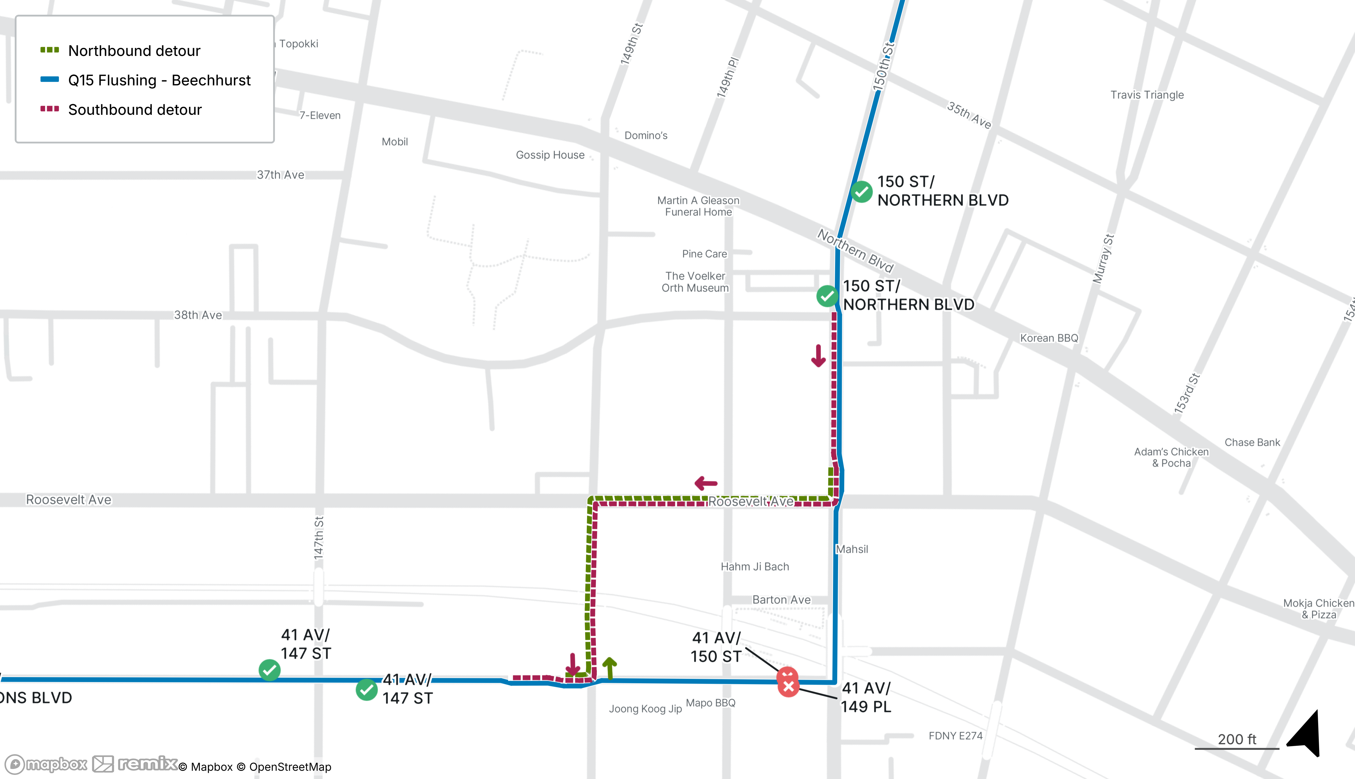 Q15 northbound stop on 41st Ave at 149th Pl and southbound stop on 41st Ave at 150th St will be closed