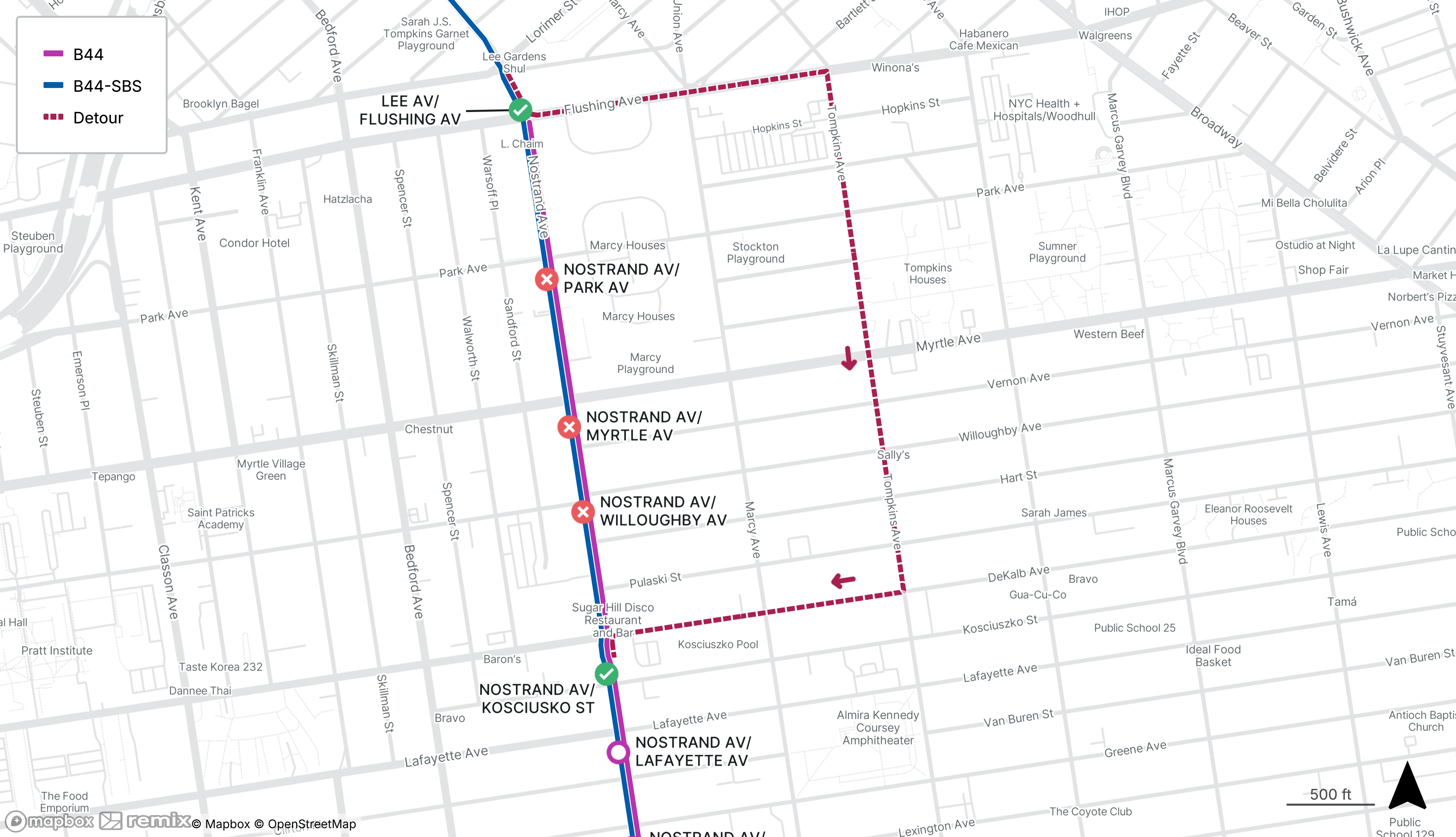 Southbound B44 all stops on Nostrand Ave from Park Ave to Willoughby Ave will be closed, no stops will be missed for the southbound B44-SBS