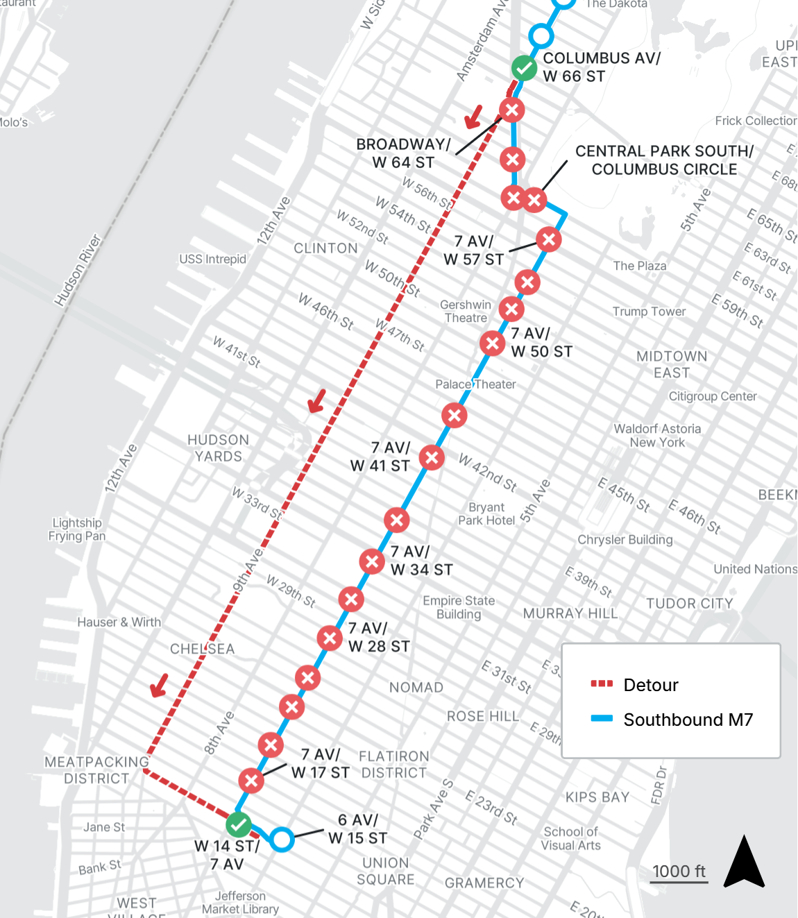 Southbound M7 buses are detoured from Columbus Ave at W 65th St to W 14th St at 7th Ave