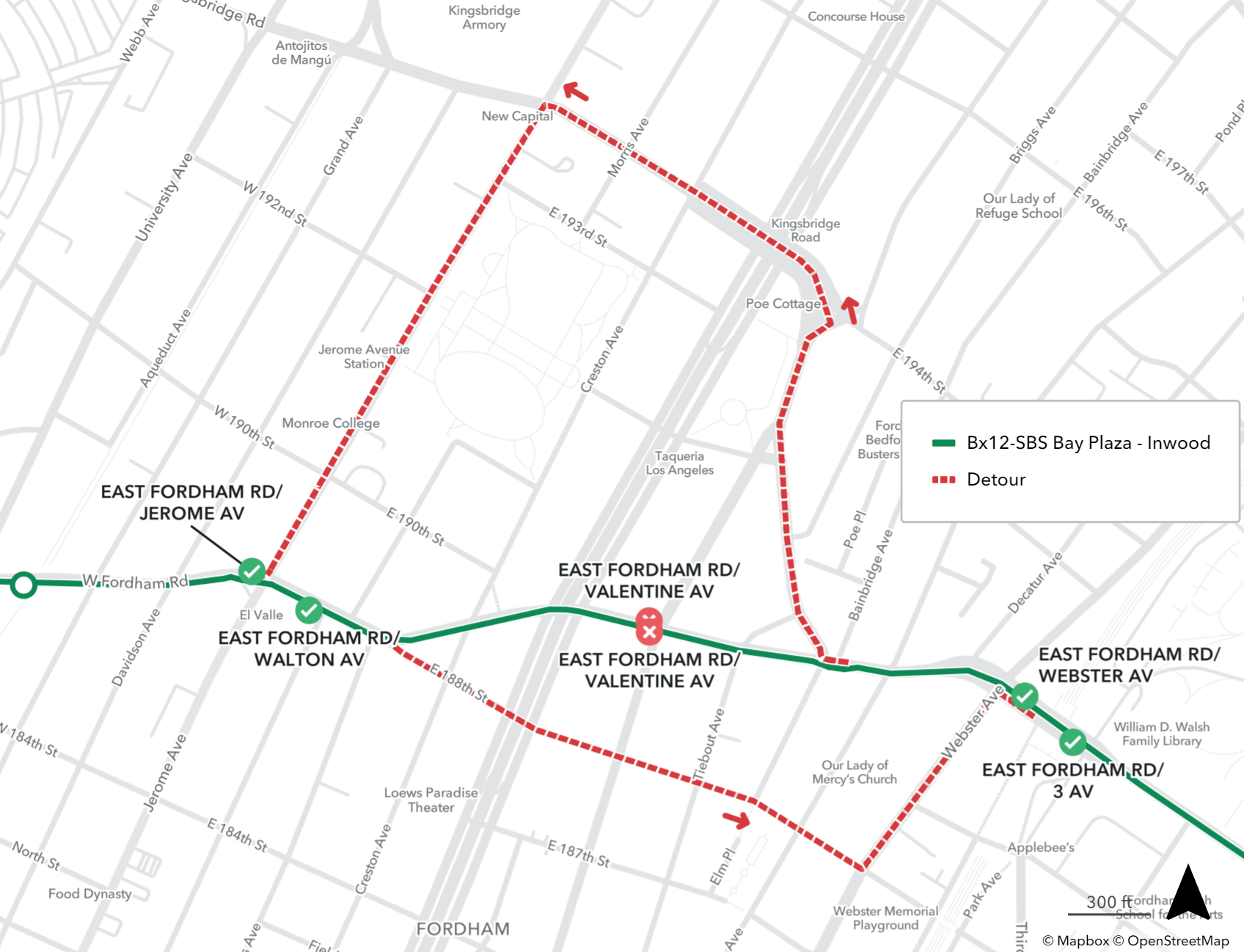 Bx12-SBS stops on E Fordham Rd at Valentine Ave will be closed in both directions