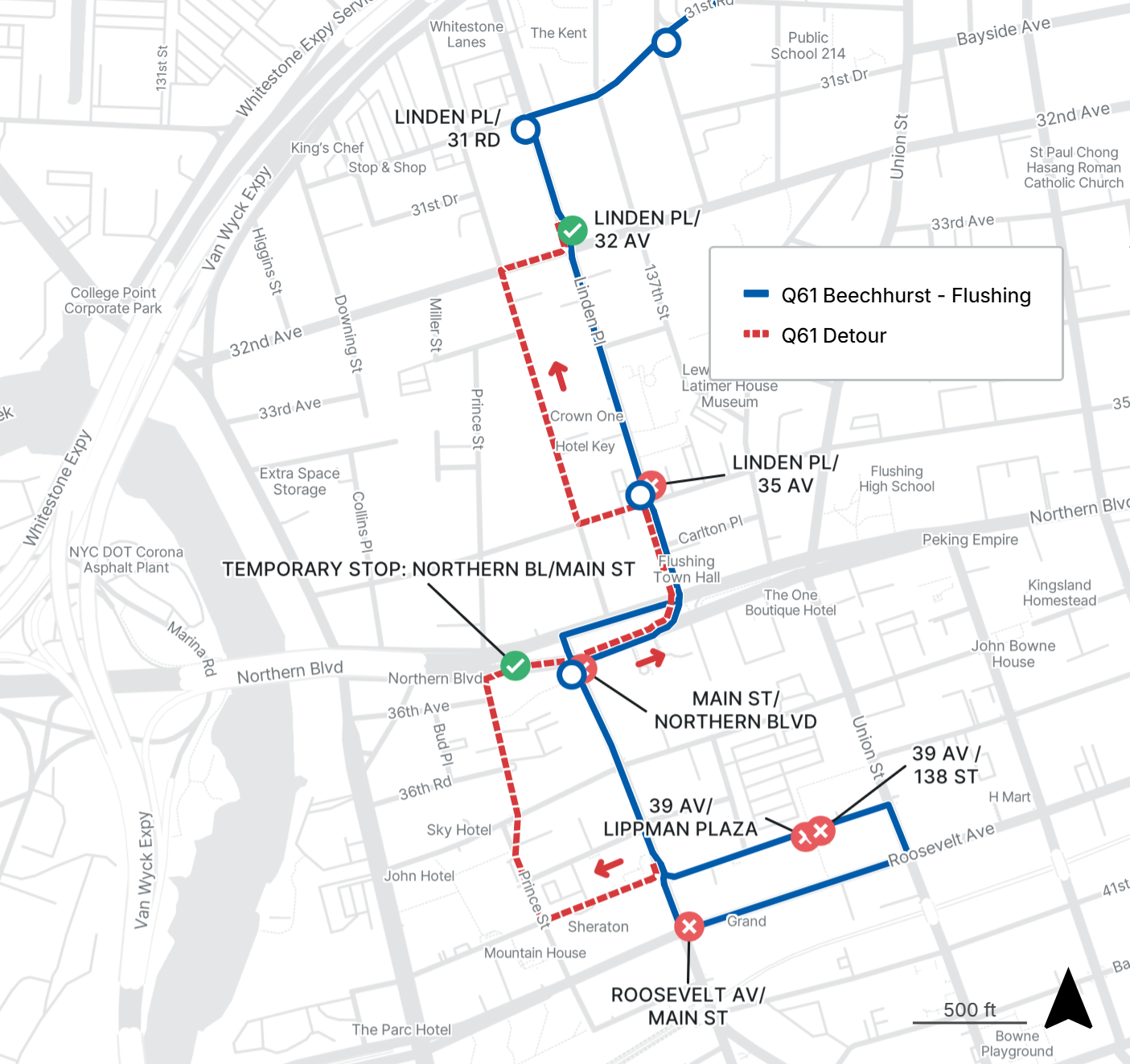 Q61 buses are detoured in both directions between 39th Ave at 138th St and Linden Pl at 32nd Ave