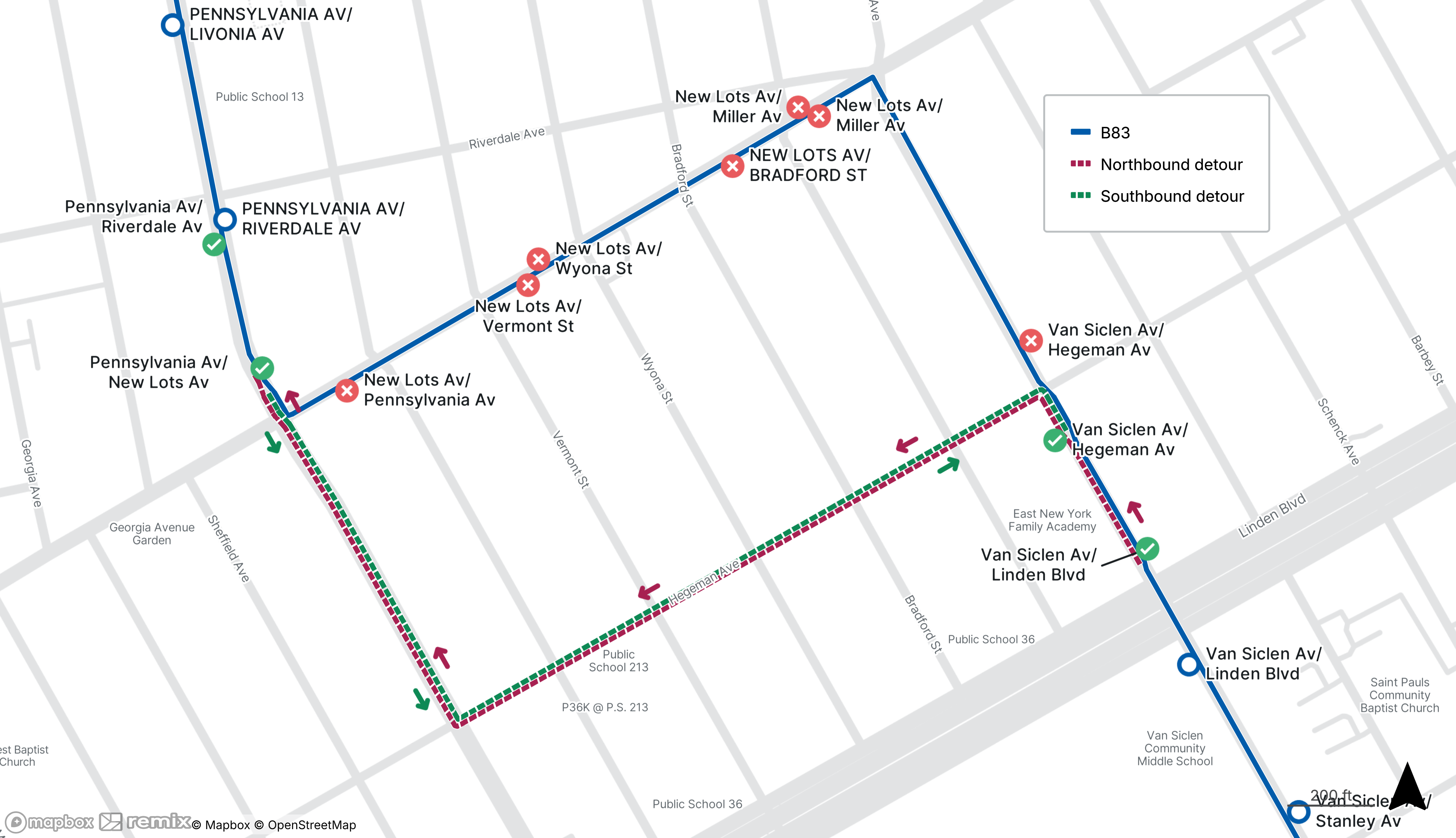 B83 buses will be detoured between Van Siclen Ave at Hegeman Ave and Pennsylvania at Hegeman Ave