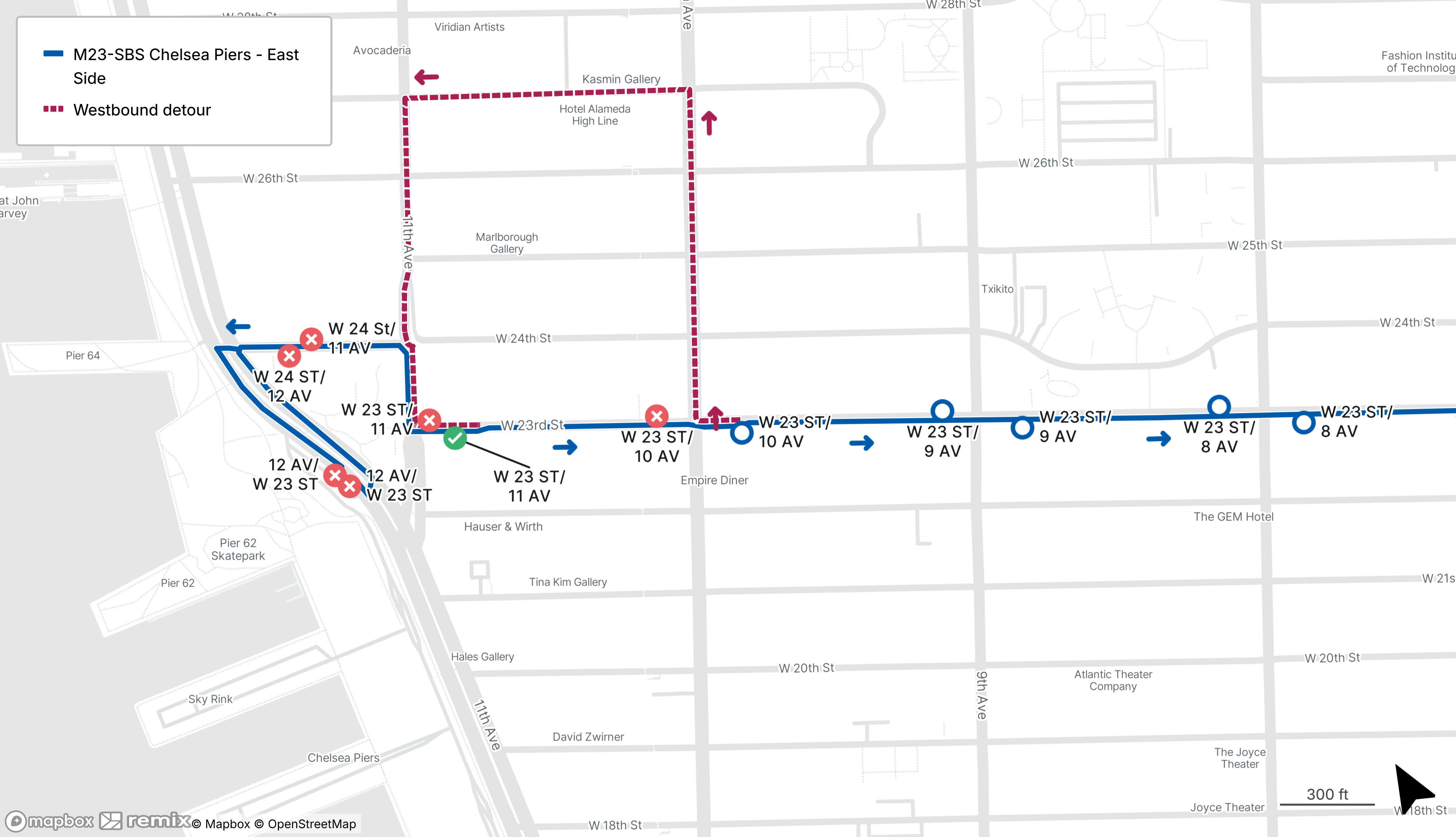 M23-SBS buses will be detoured between 12th Ave at W 23rd St and W 23rd St at 10th Ave