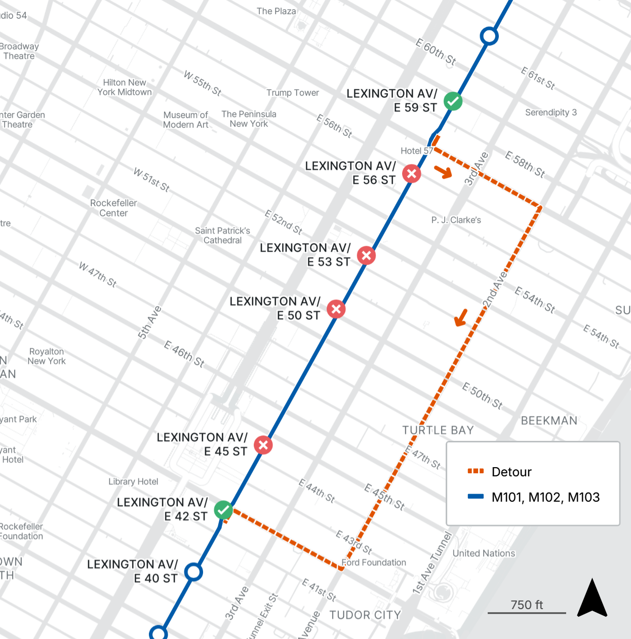 Southbound M101, M102 and M103 buses are skipping the stop on Lexington Ave at E 46th St; use the temporary stop on Lexington Ave at E 45th St instead