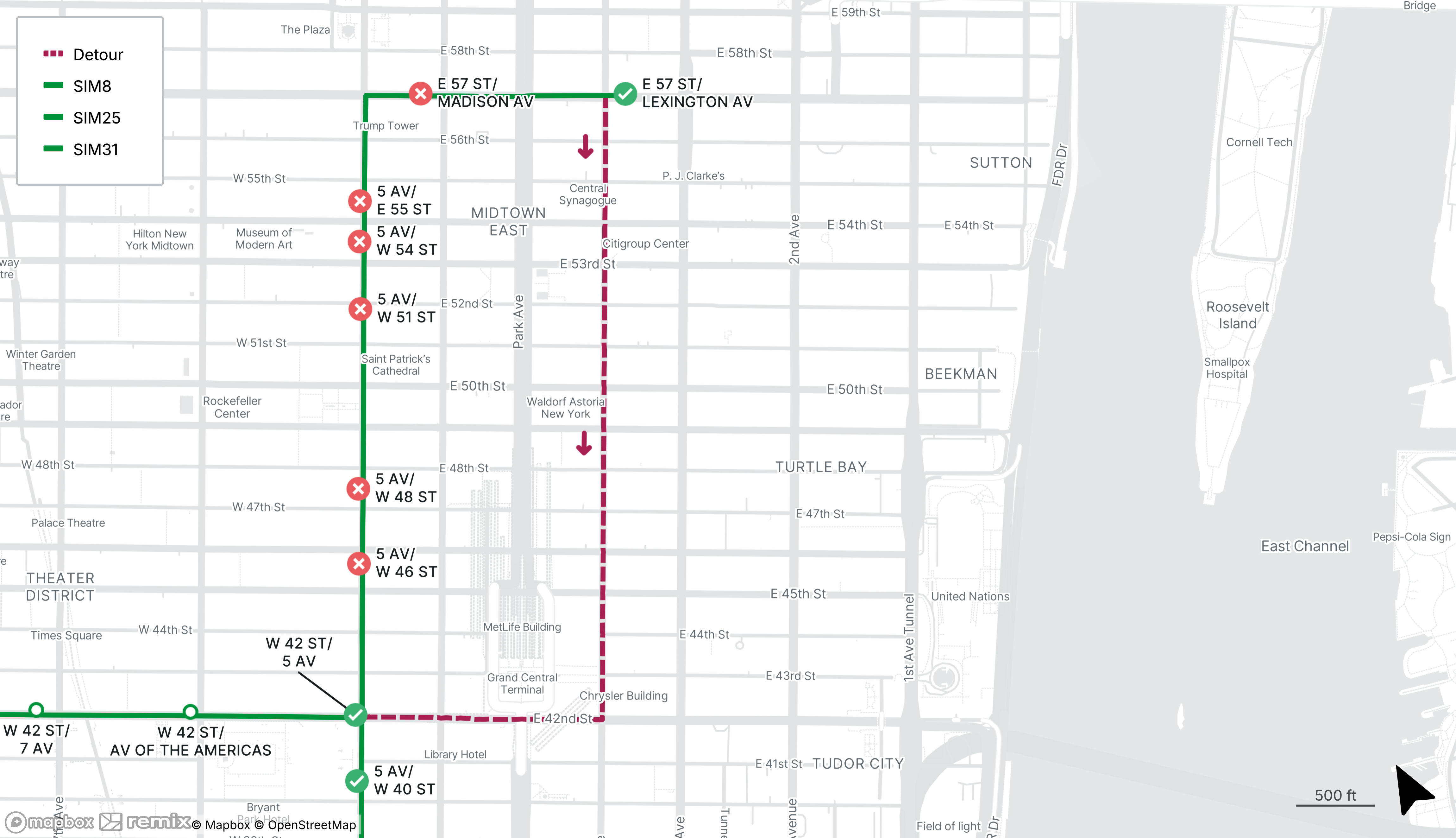 Southbound SIM8, SIM25 and SIM31 stops on E 57th St at Madison Ave and along 5th Ave from E 55th St to E 46th St will be closed