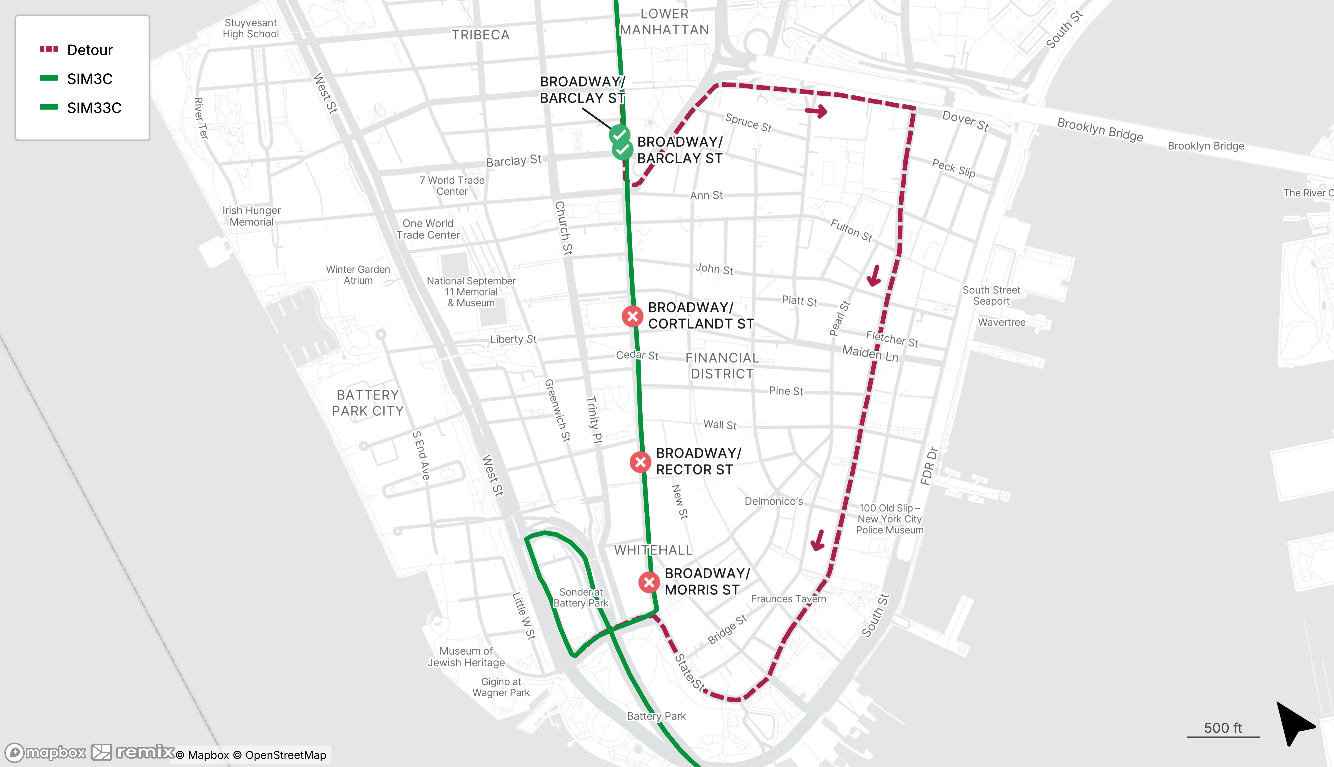 Southbound SIM3C, SIM33C stops on Broadway from Vesey St to Morris St will be closed