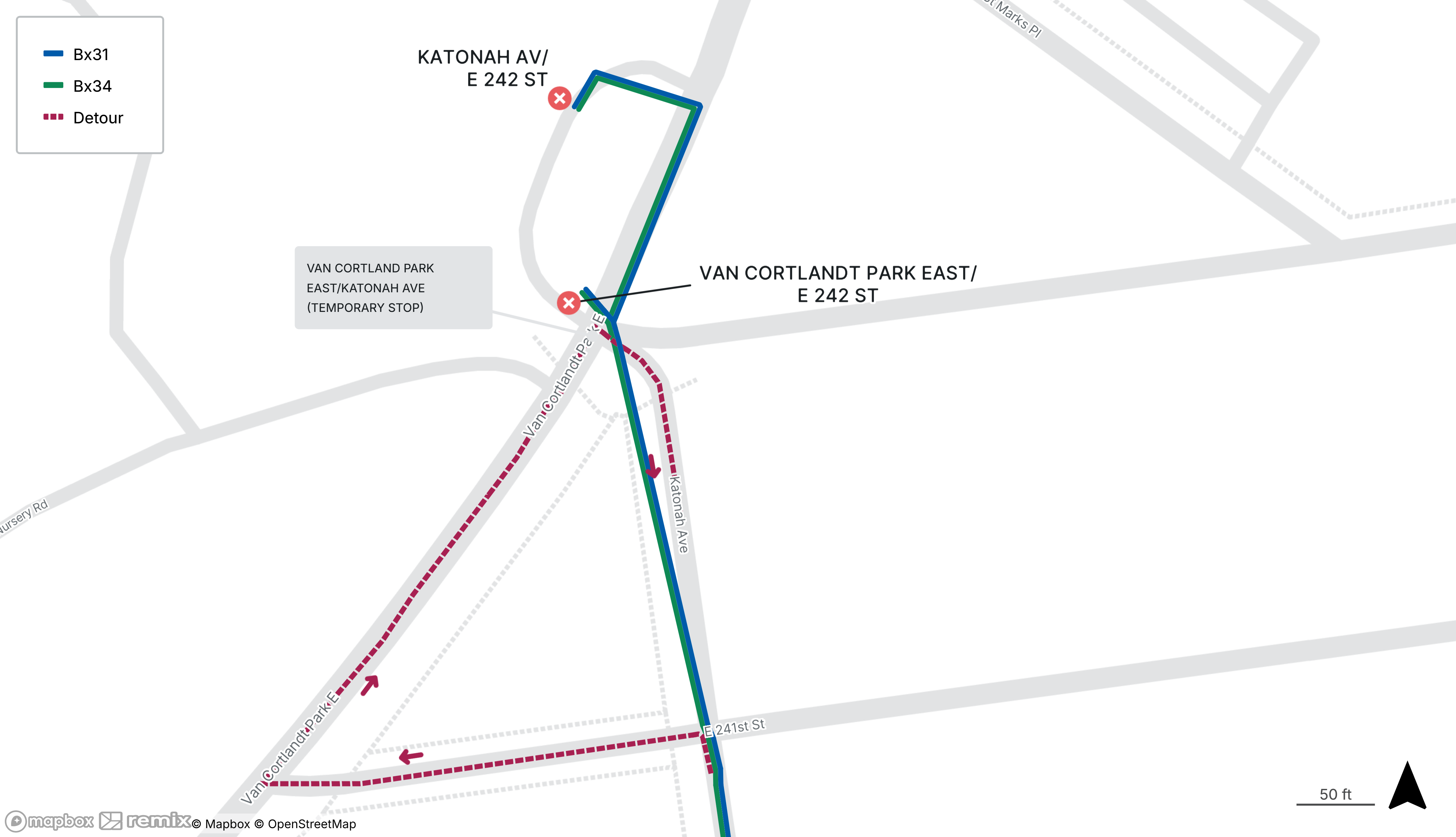 Bx31 and Bx34 stops on Katonah Ave at E 242nd St and Van Cortlandt Park East at E 242nd St will be closed