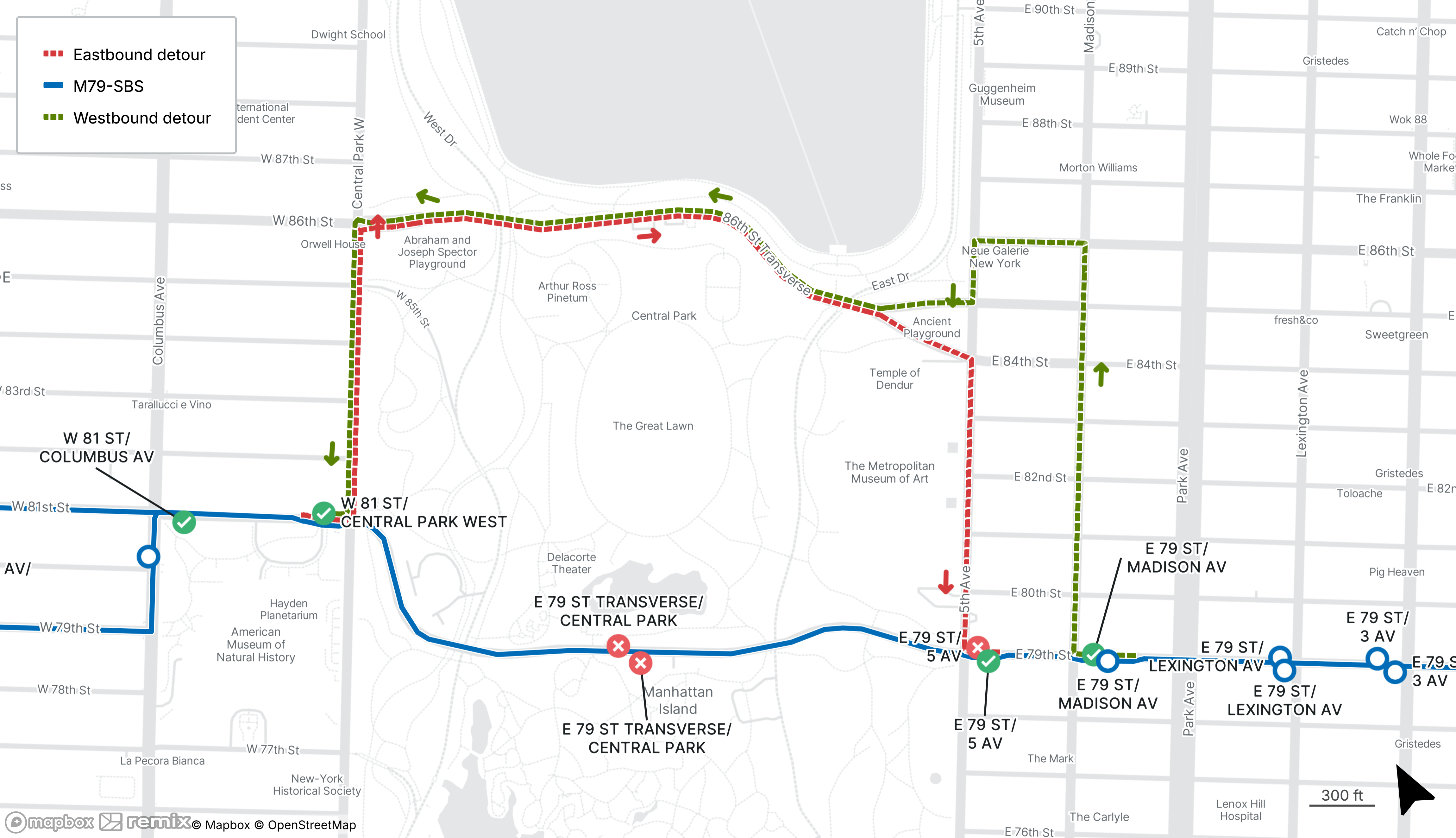 M79-SBS buses will be detoured from the E 79th Street Transverse between E 79th St at Madison Ave and Central Park West at W 81st St
